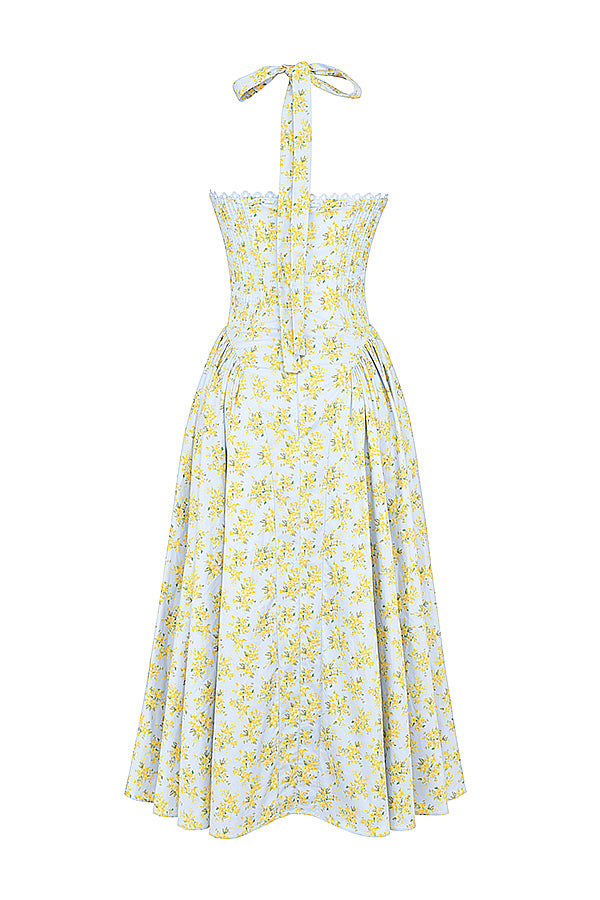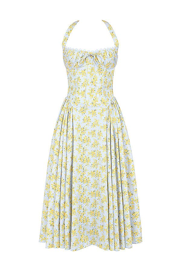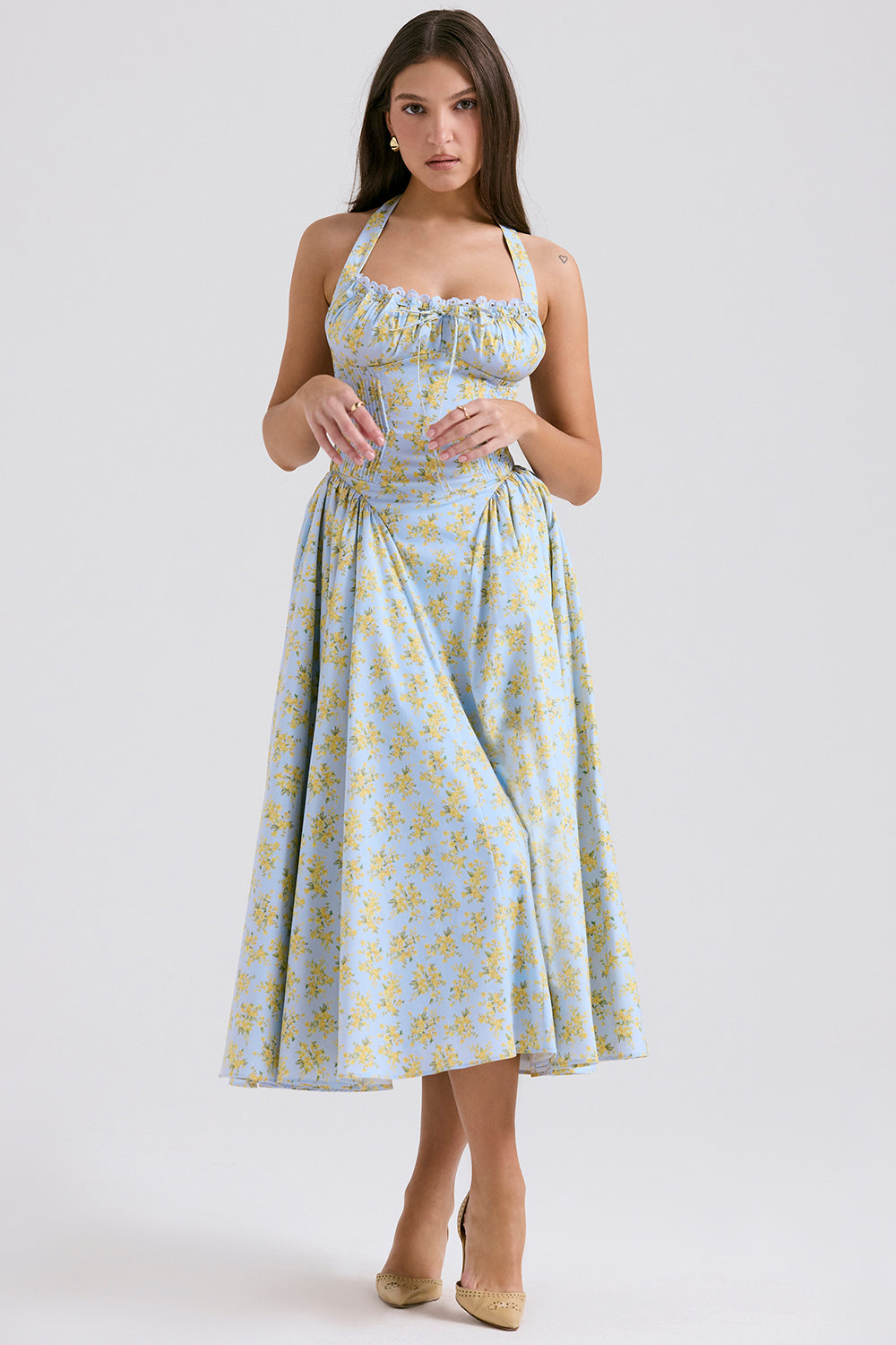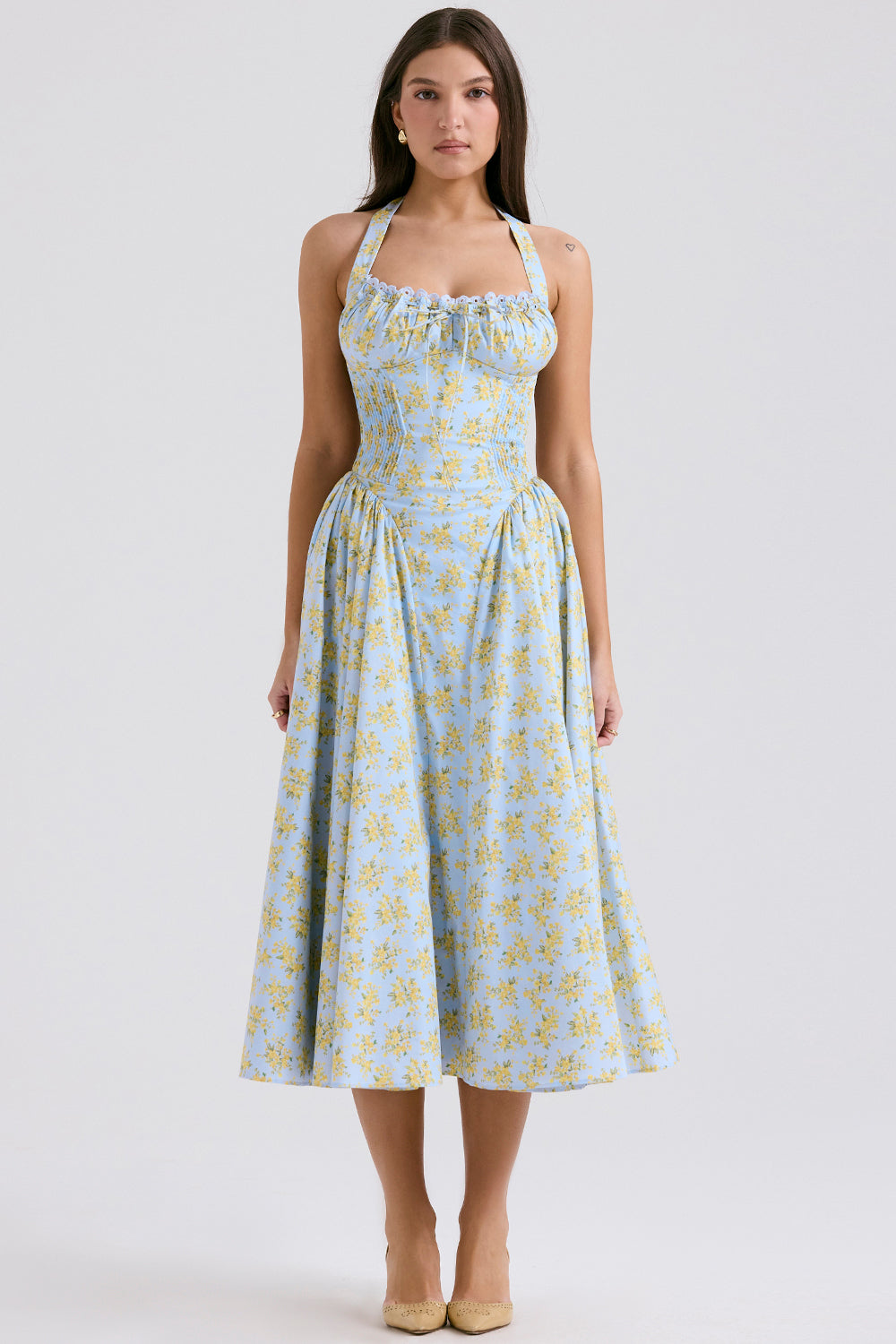 Our 'Adabella' midi sundress is printed with a gorgeous soft blue floral print that has us dreaming of Spring sunshine and balmy Summer days. Cut from stretch cotton, it has a prettily gathered bustier neckline with wide self tie halter straps and a flattering fitted bodice.