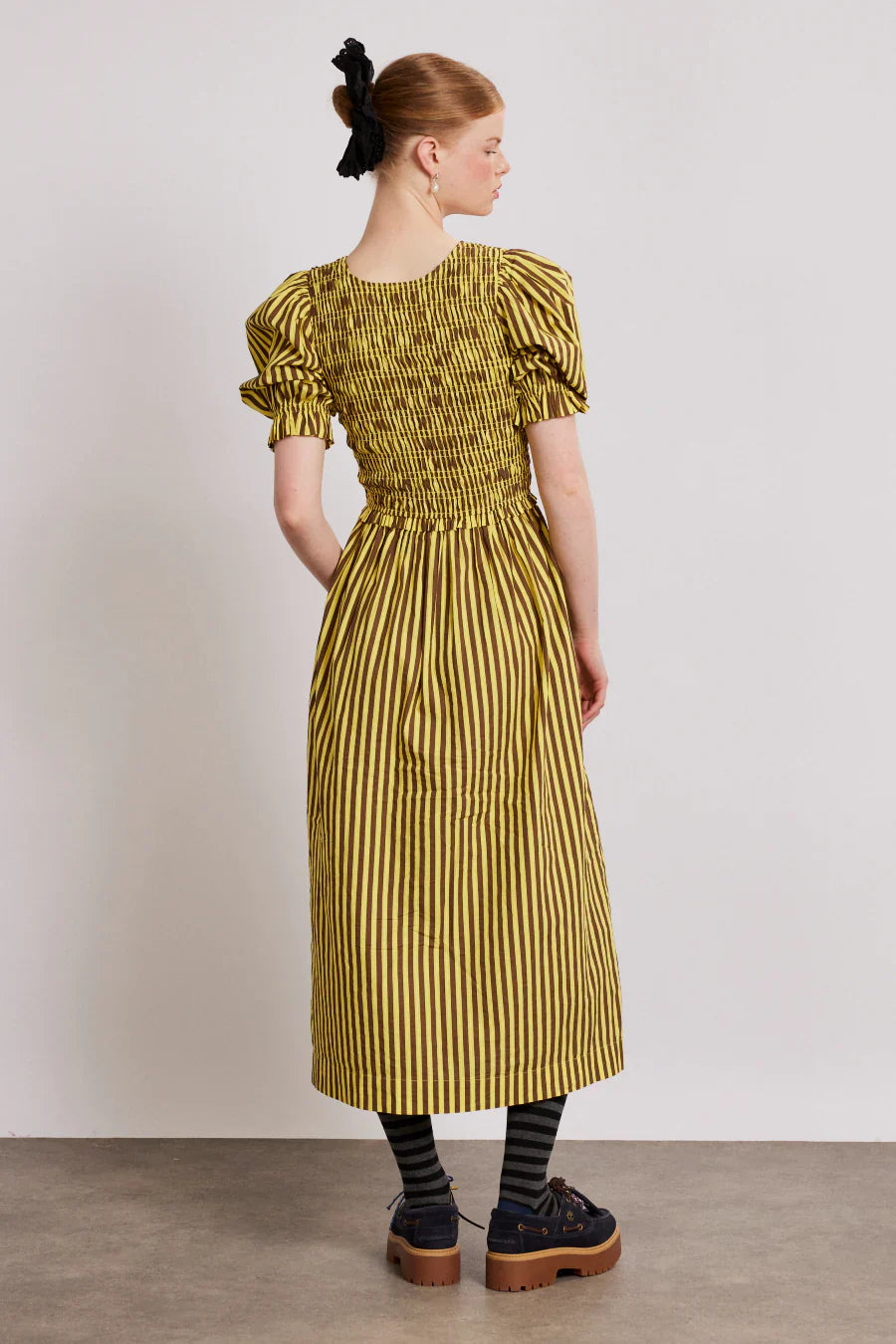 Our popular Bluebelle dress now comes in a midi length. with side seam pockets. puff sleeves and a shirred bodice. It's fully reversible too.