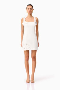 Crafted from a new stretch fabrication, it offers a sculpted yet flexible fit that flatters without restricting. Inspired by the structure of our iconic Trompe dress, this version brings a lighter, more ethereal vibe in crisp white. Delicate 3D floral accents bloom across the bodice and straps, adding texture and romance with every step.