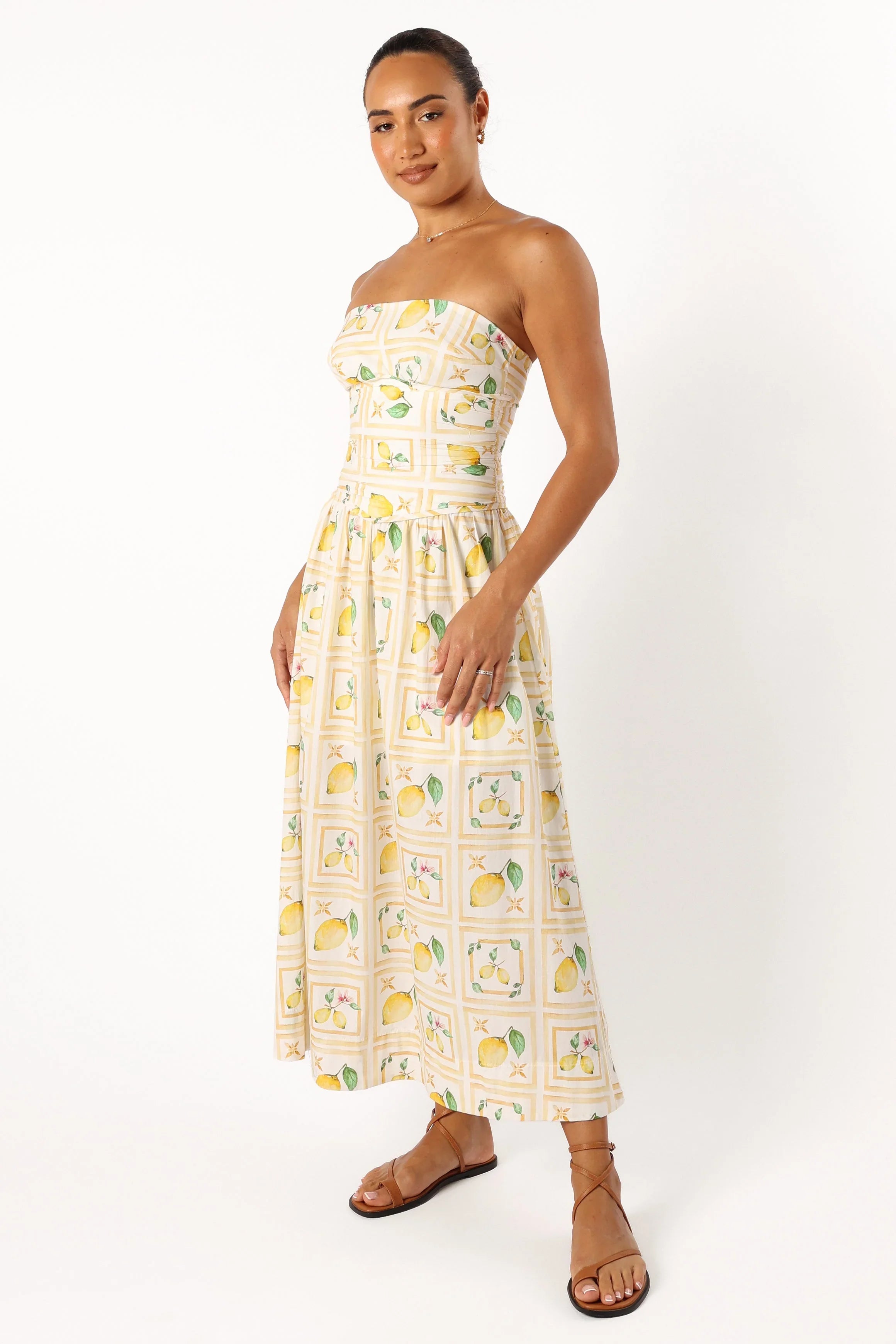 | DETAILS Say hello to our strapless midi dress with straight neckline and ruched bust detail. The lemon print adds an extra bit of fun to its already timeless look. Plus, a back invisible zip with hook and eye clasp ensures you can move seamlessly from day to night in style.