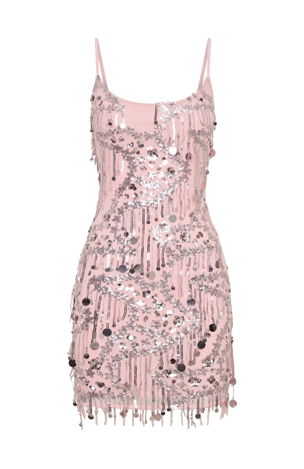 Your birthday, your rules! The Decadent Daze Beaded Mini Dress in Baby Pink features dainty adjustable straps, a flattering scoop neckline, and a body‑skimming silhouette. Lush floral sequins and tassel beading on the hem bring playful elegance, and with its fully lined, high‑stretch fabrication, you’ll be glam and comfy all night. Style with statement earrings and kitten heels for an all eyes on you bday fit!