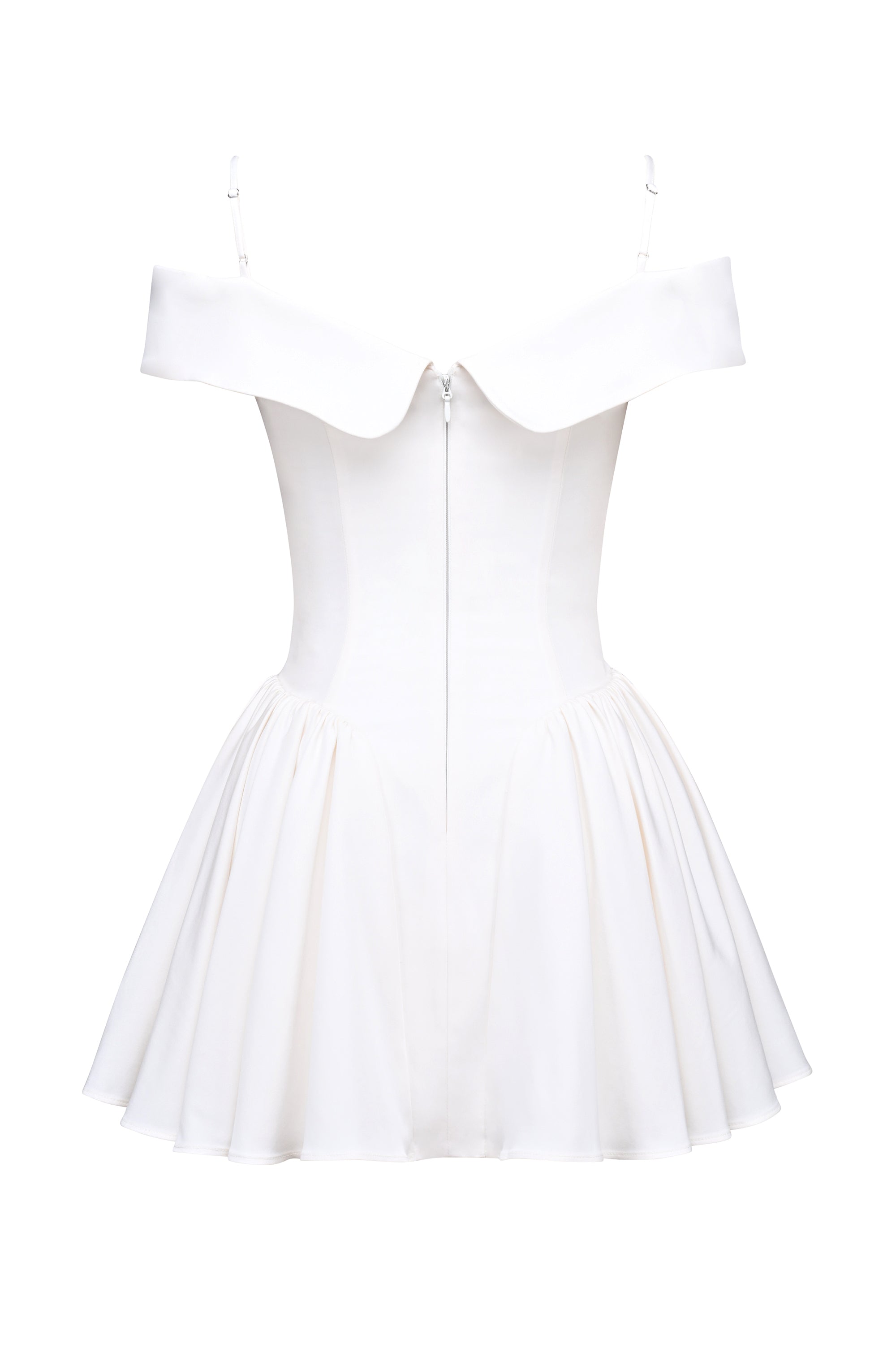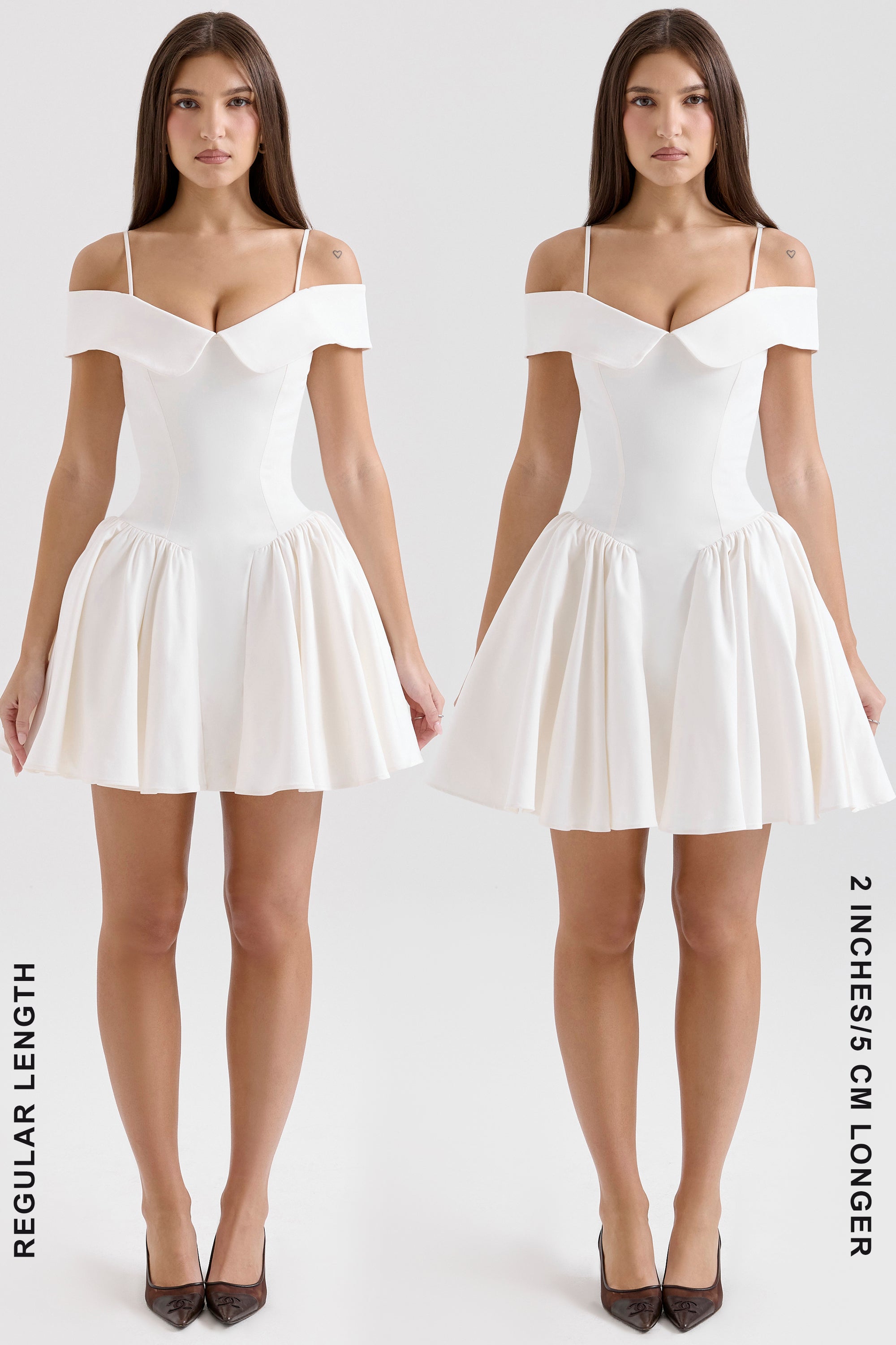 Classically curated, the 'Elida' offers elevated tailoring from a flirtatious point of view. Crafted from a peached twill fabric, the exaggerated collar sits off the shoulder to show some skin – it's the perfect peek-a-boo moment. With a zip at the back and straps for added support, our refined corseting comes into play by creating a curved silhouette that cinches at the waist. It's a contrast to the mini length skirt made with a structured tulle lining for lots of volume. It's a playful moment, and we're here for it...