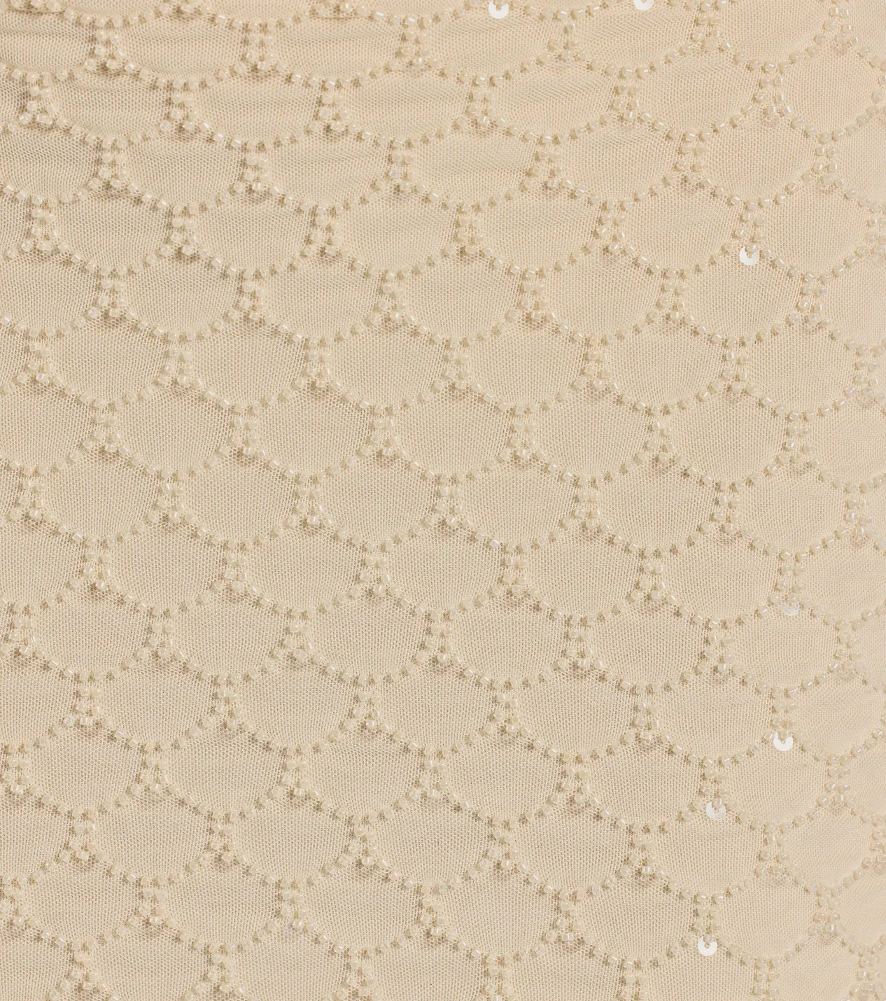The Emery mini dress is crafted with clear sequin and beaded embroidery in a chic scalloped pattern on the lined mesh fabric. It features a sleeveless cowl neckline, bungee spaghetti straps that cross at the back with a tie closure, and a short bodycon silhouette to highlight your stunning curves. Complete the look with a rhinestone clutch.