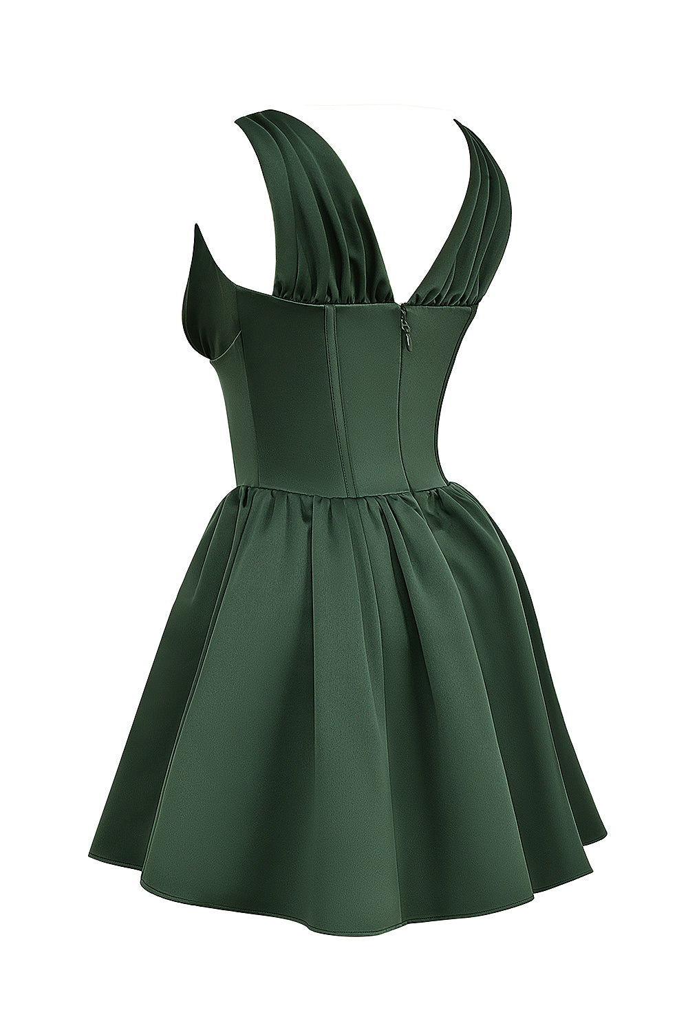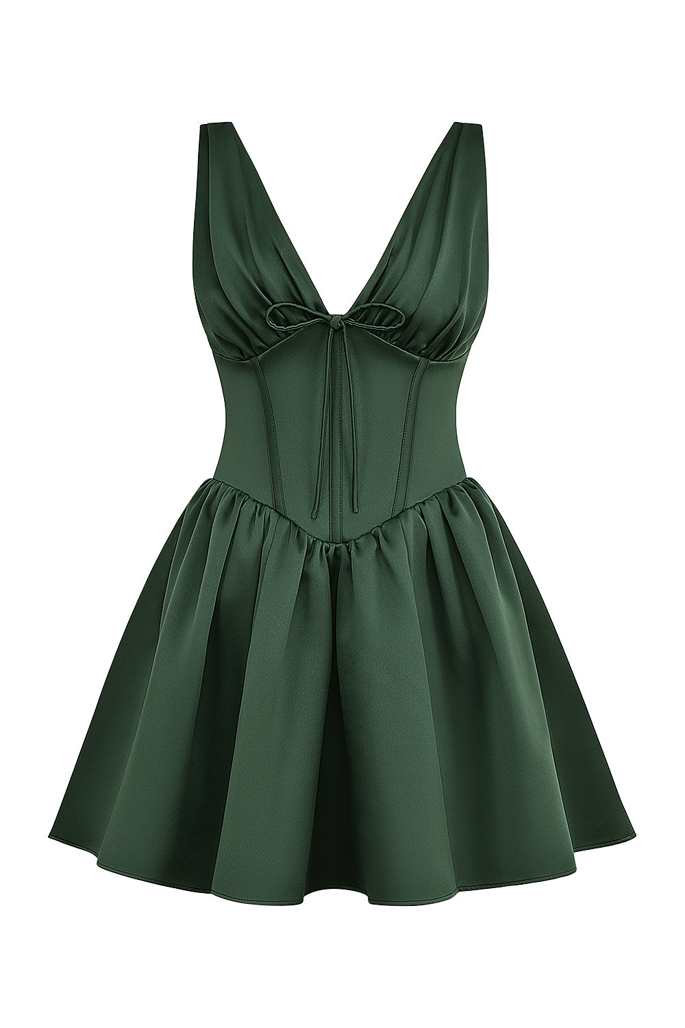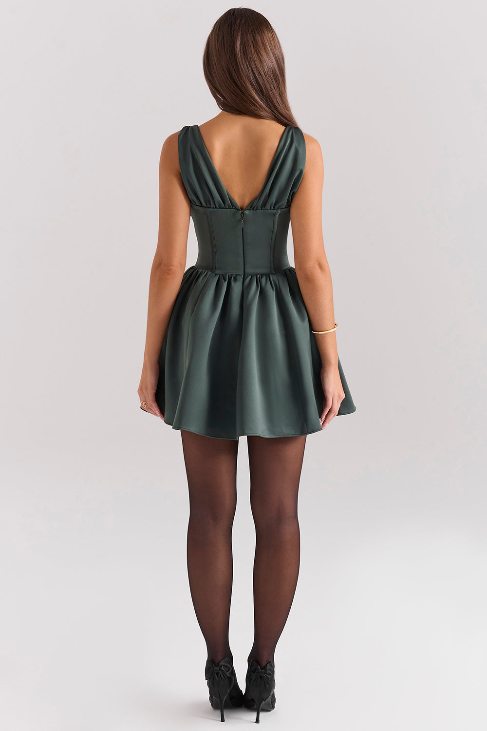 The night-out dress you’ve been daydreaming about. ‘Emmeliette’ is meticulously cut from a lavish forest green satin, accentuated by a boned bodice and a plunging neckline that, as the cherry on top, we’ve finished with bow accents.