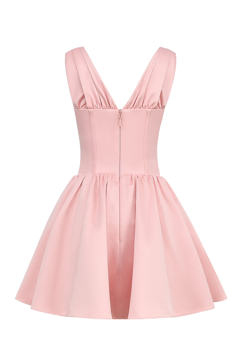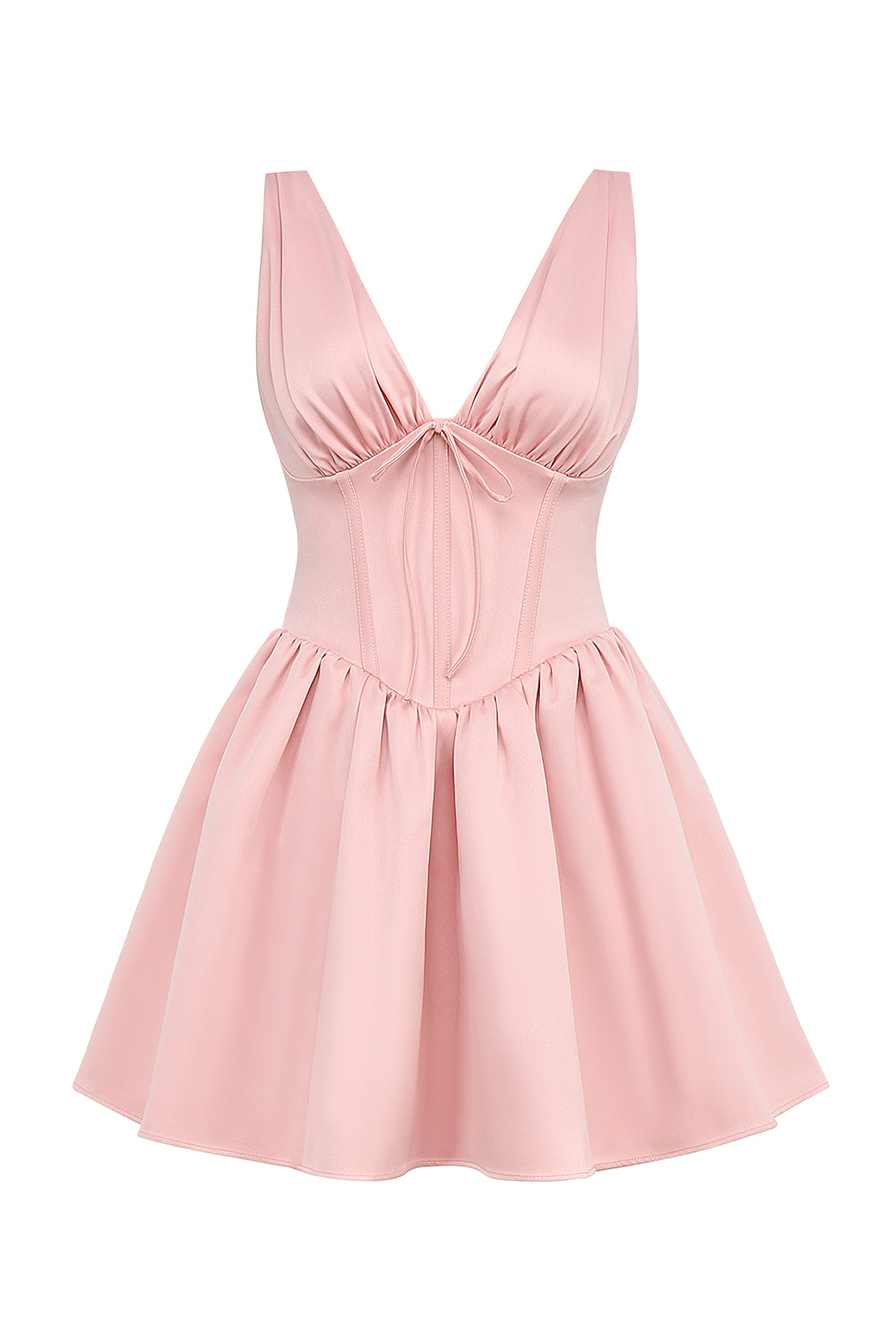 The night-out dress you’ve been daydreaming about. ‘Emmeliette’ is meticulously cut from a lustrous pink satin, accentuated by a boned bodice and a plunging neckline that, as the cherry on top, we’ve finished with bow accents.
