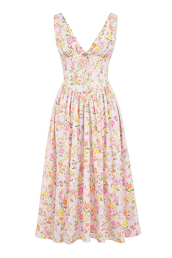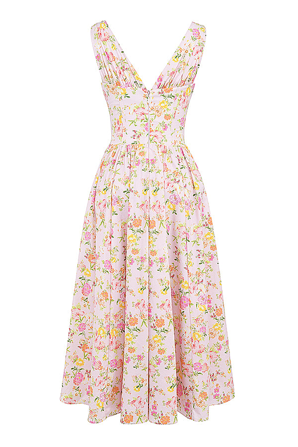 Channeling understated elegance, 'Emmelina' is an effortless wear-anywhere style in a gorgeous pink Meadow print. The cotton rich fabric is blended with stretch and beautifully designed with a gathered bust. The plunge neckline perfectly mirrors the open back and the bodice is corseted to cinch the waist.