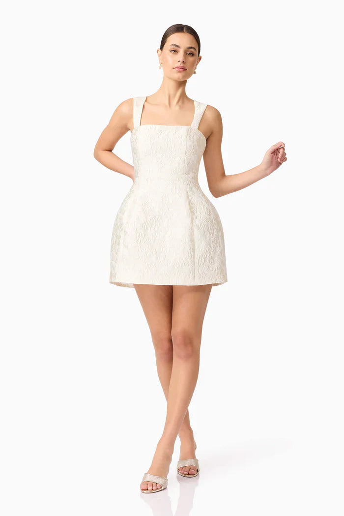 The tulip skirt gracefully flares out, creating a feminine and flattering silhouette. The delicate folds and gentle curves of the tulip shape add an elegant touch, making this mini dress a versatile choice for a variety of events. The dress is made from a jacquard fabrication, providing subtle texture and depth that elevates its overall look.