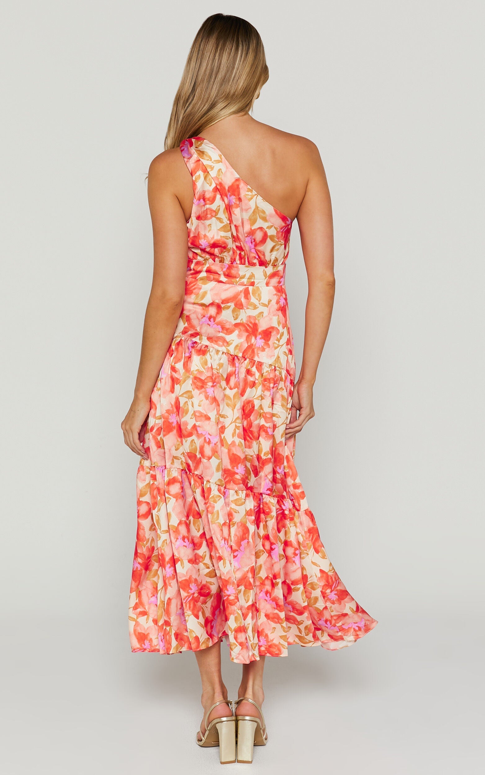 Get ready to turn heads in our Georgine Midi Dress! This stunning one-shoulder dress features a beautiful autumn floral print that is perfect for the season. The ruched tiered detailing adds a touch of elegance and creates a flattering A-line silhouette. Made from high-quality materials, this dress is not only stylish but also comfortable to wear. Whether you're attending a cocktail party or going out for brunch with friends, the Georgine Midi Dress is sure to make you feel confident and empowered. Available in vibrant orange, this dress will make you stand out from the crowd. Shop now and get ready to make a statement at your next event!Product Details:A Line DressCocktail End UseDresses Subcategory