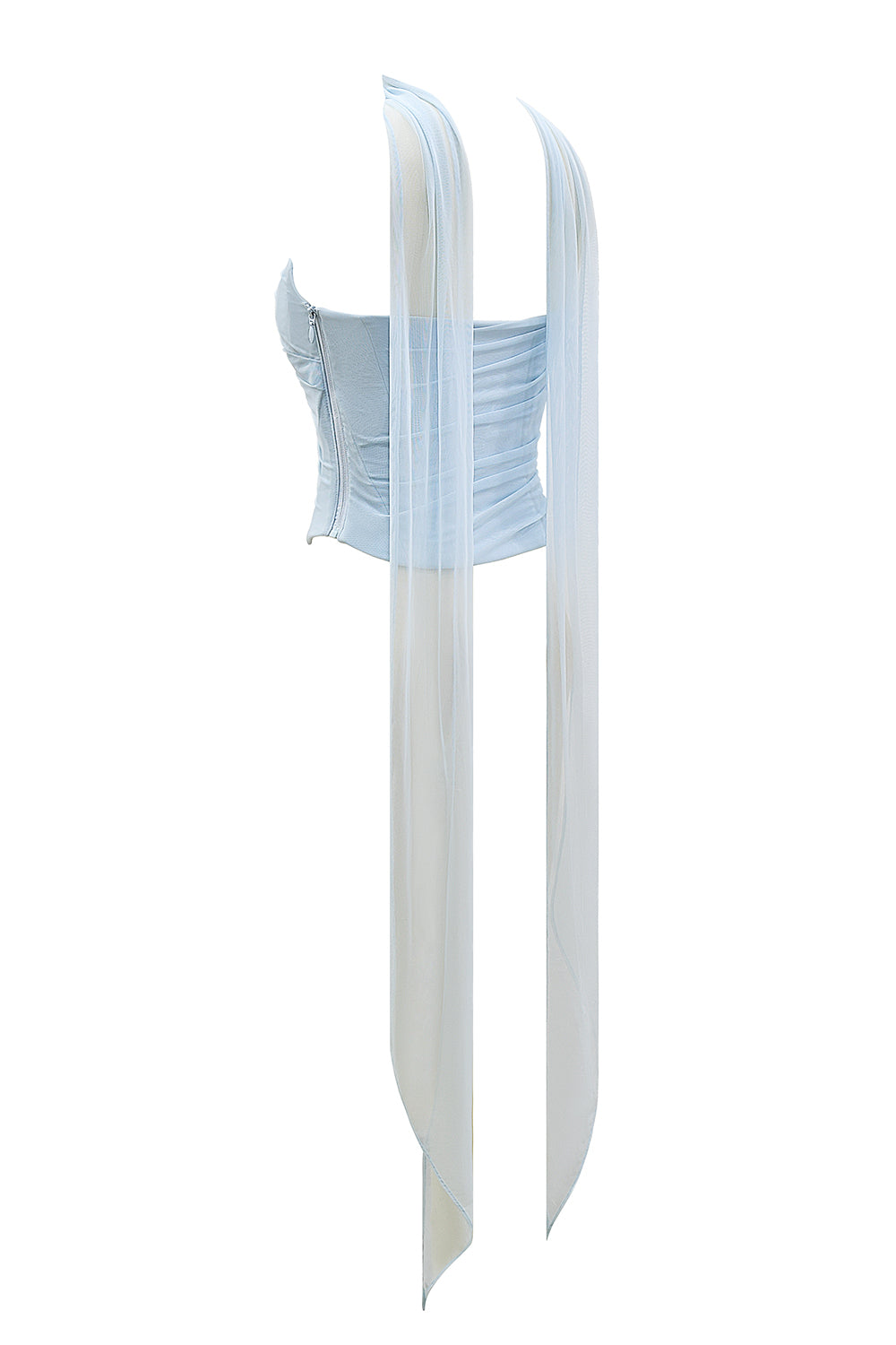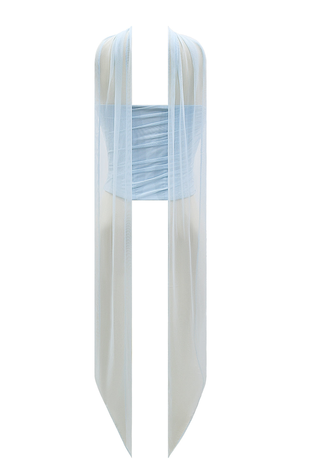 'Hallie' is our romantic date-night corset that looks so beautiful paired with our 'Cassidy' maxi skirt. Made from stretch mesh, it has a strapless neckline and the bodice is fully corseted to cinch and shape your waist. The pretty gathering creates that ultra soft and feminine vibe and we adore the neck scarf that trails for added drama.