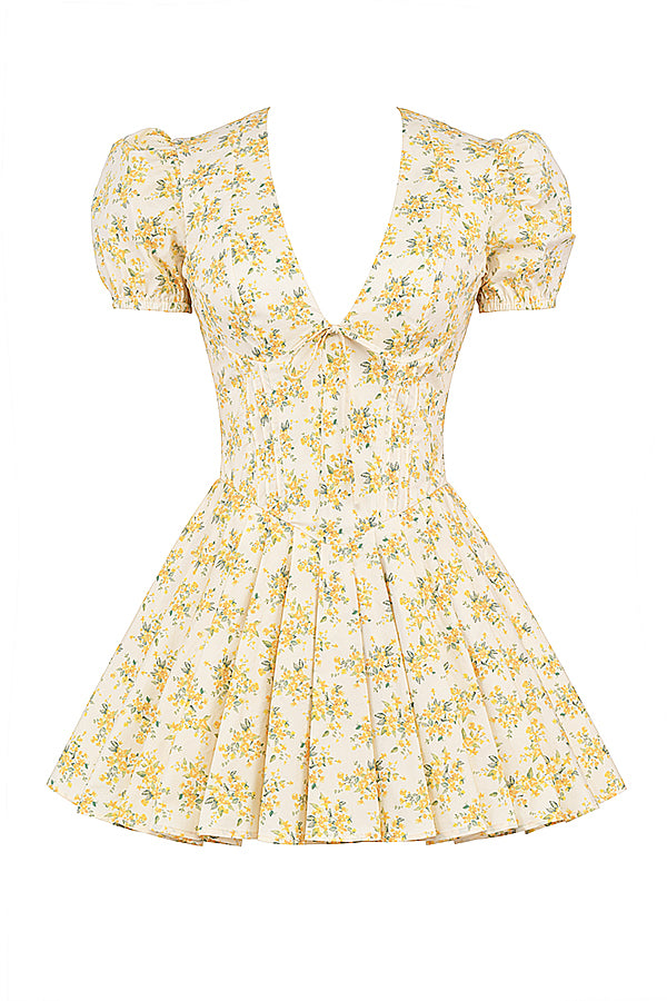 Imani Buttercup Vintage Floral Print Pleated Cotton Mini Dress