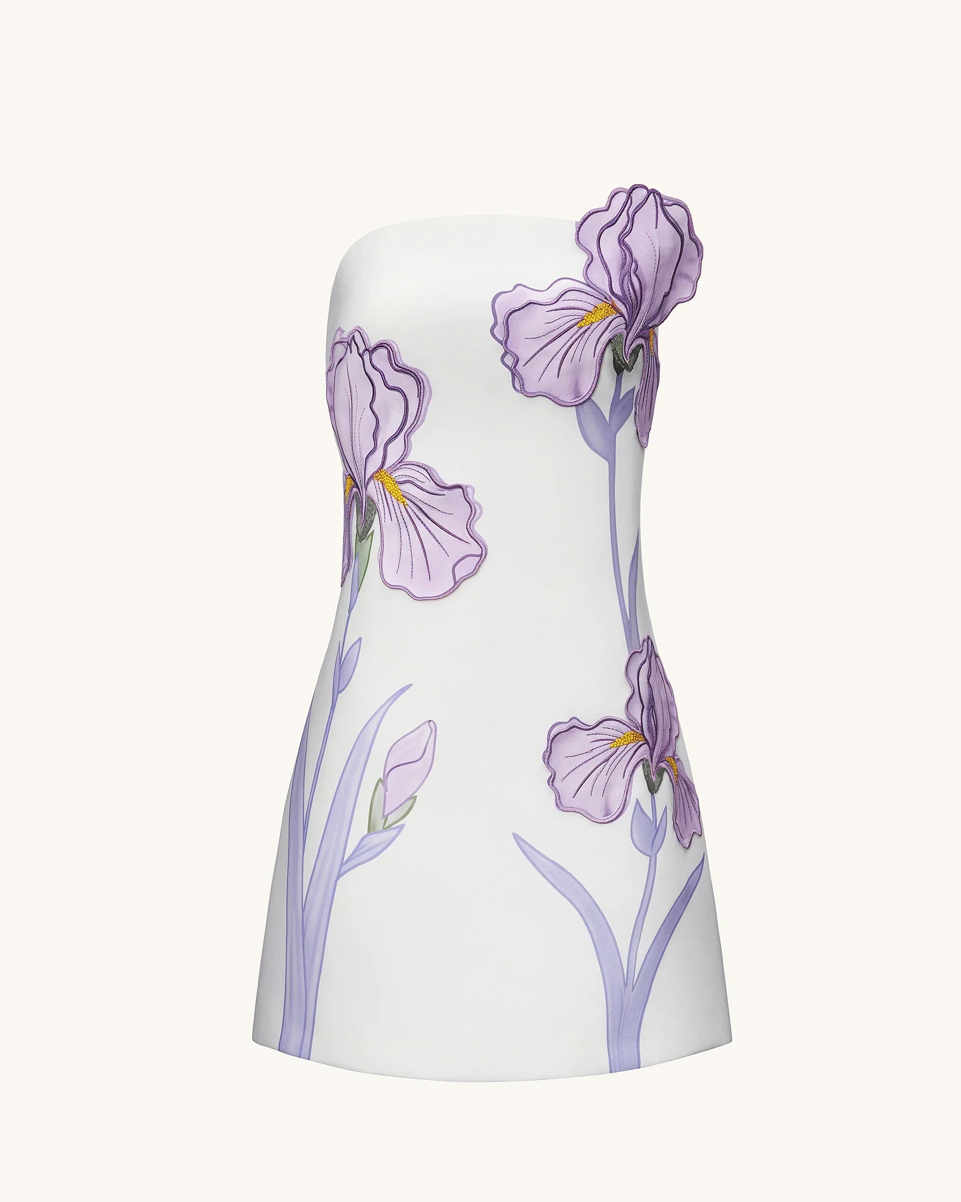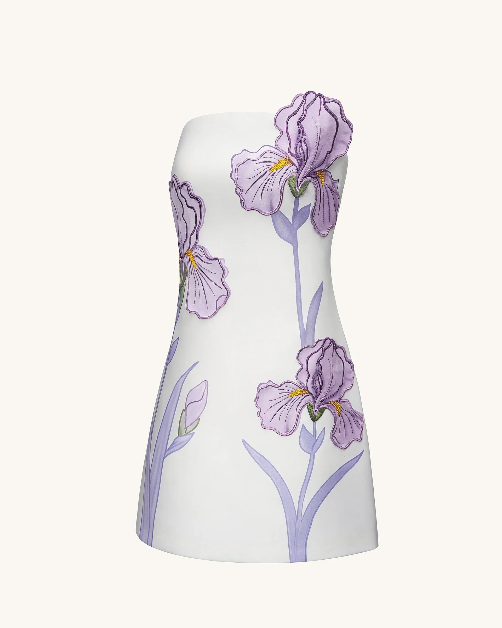 This strapless mini dress features a fitted silhouette and a smooth, crisp fabric. Large iris flower motifs in pastel purple and green create a bold visual across the front. The clean hemline finishes just above the knee. The look is minimalist with statement flower graphics.