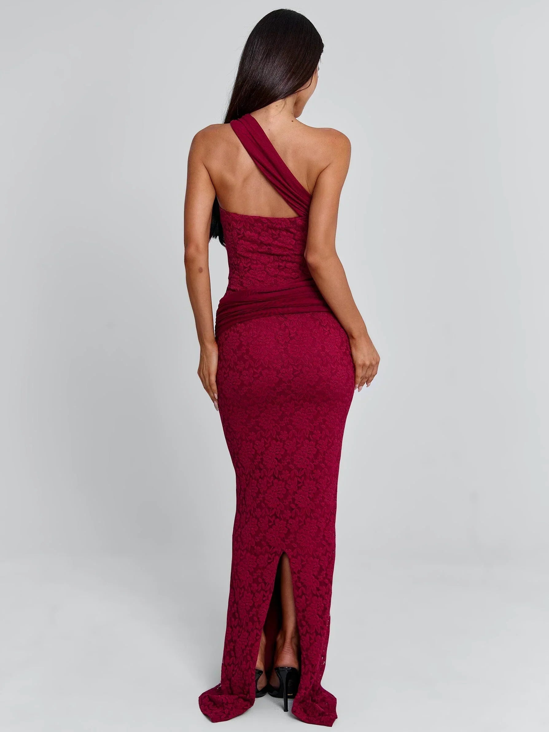 Crafted from a lace fabrication and fully lined, Irma features contrast jersey panelling that enhances the figure. The design is finished with a fixed waist tie that drapes elegantly, creating a flattering silhouette.?With its one-shoulder neckline and floor-skimming length, this dress is the epitome of effortless sophistication!