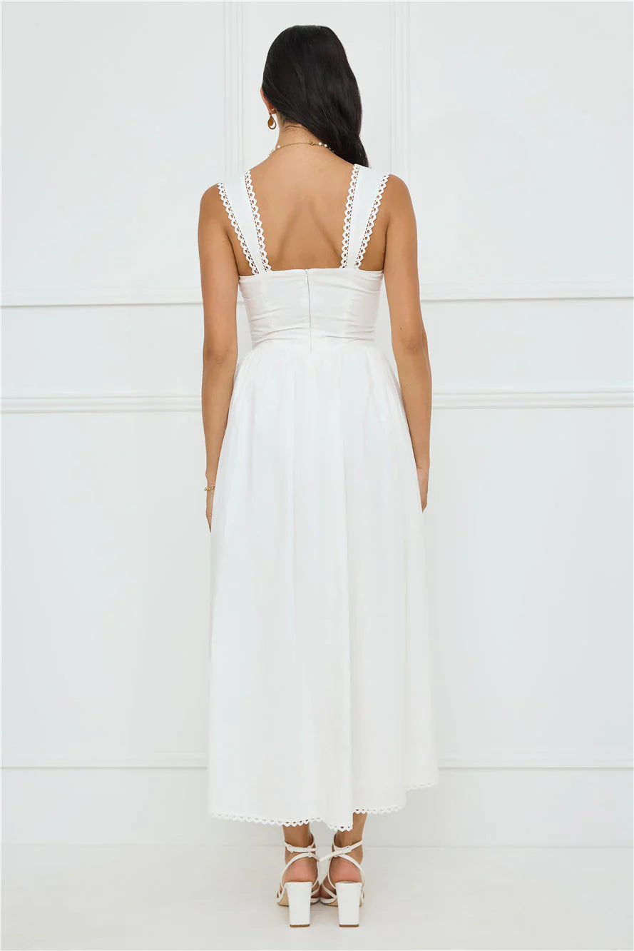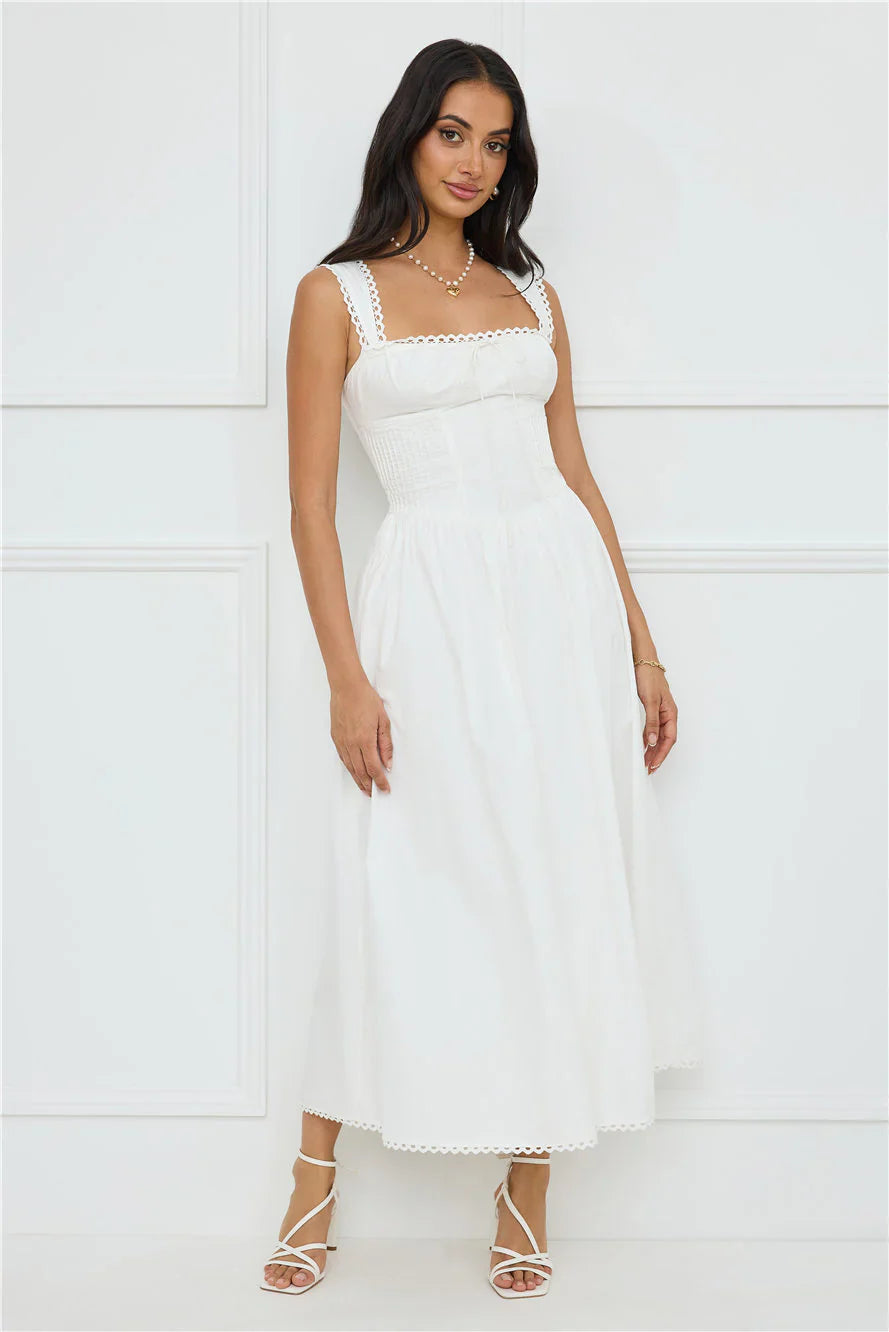 Love the look you're in with the Luxe Serene Midi Dress. It features a gorgeous embroidered trim to the shoulder straps, neckline and hem, a flowy skirt, a tie-up neckline and a pleated bodice. Style with heels.