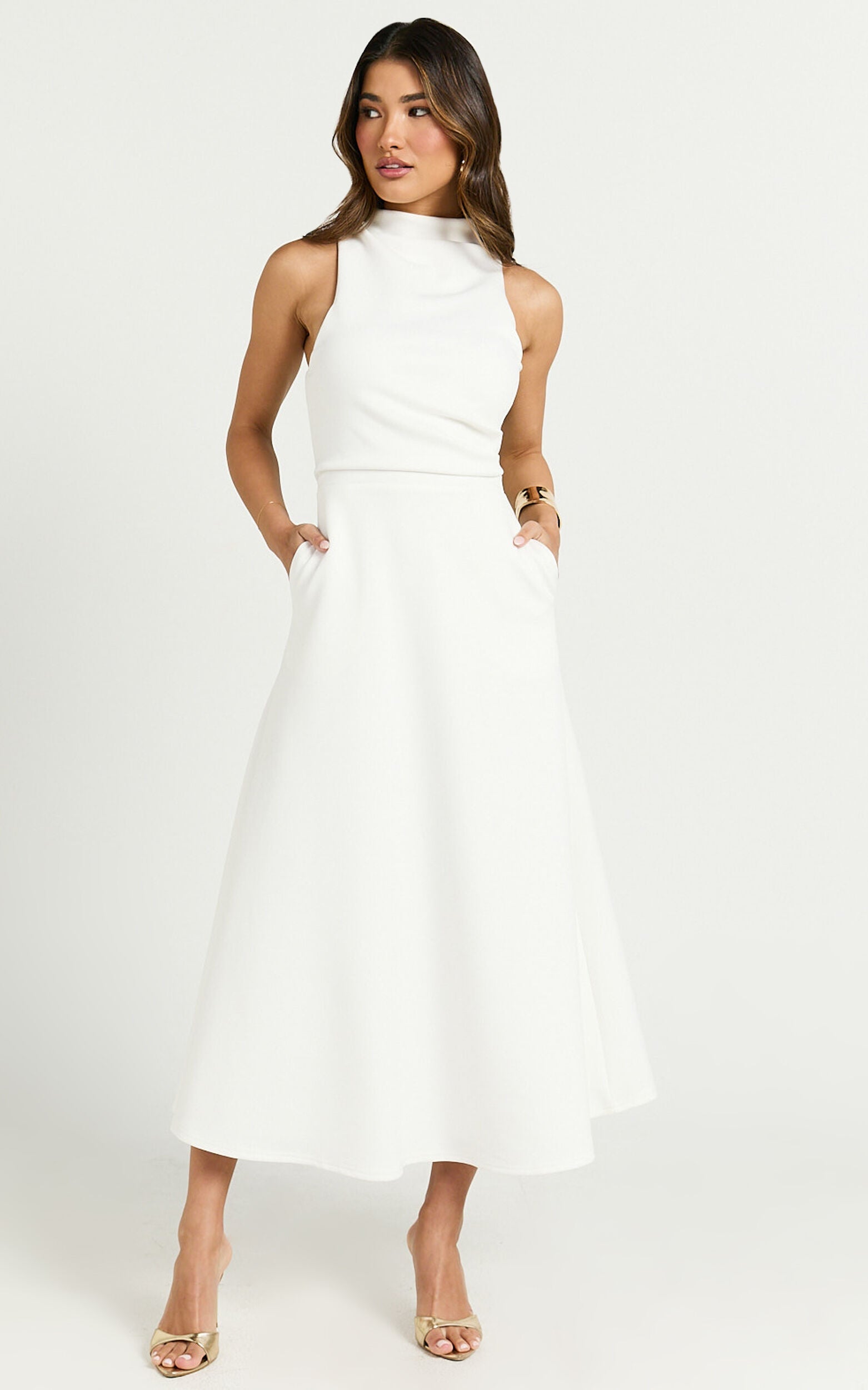 Discover the perfect look in our Macy Midi Dress - a true embodiment of grace and empowerment. This high-neck, sleeveless A-line dress, rendered in an impeccable off-white shade, is your go-to for transcending from a day of confidence to an evening of elegance. Crafted from a luxurious blend of ponte and polyester, this dress promises both comfort and style, seamless for any occasion - from an empowering day at the office to a memorable party night.