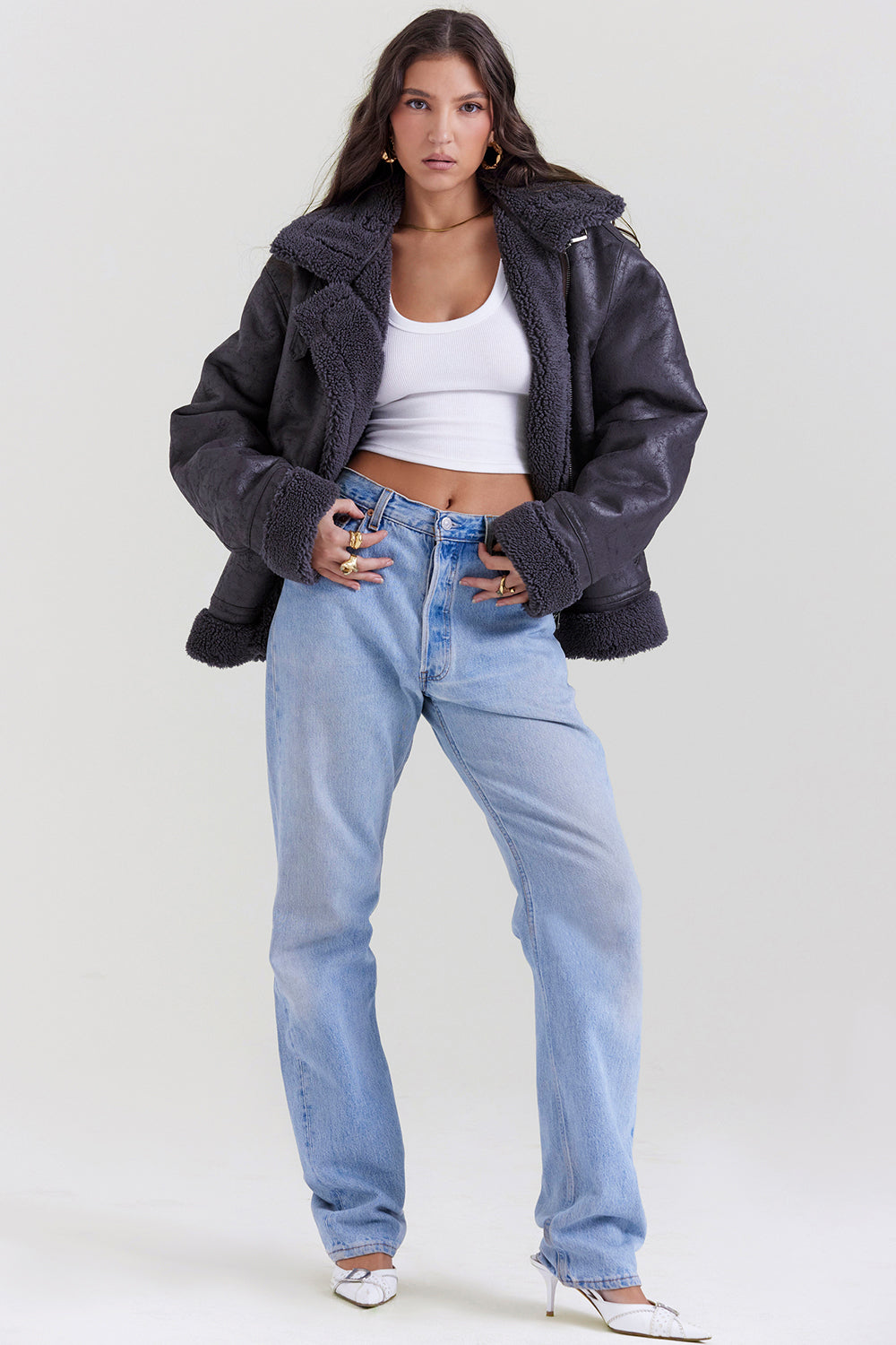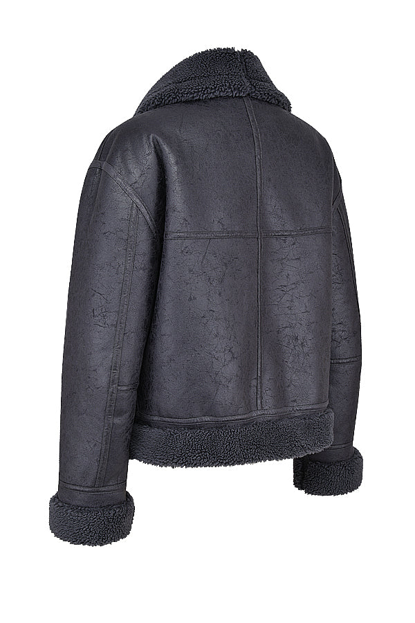 Our 'Madden' jacket is designed in the classic aviator style and is sure to be a forever piece. Cut for an oversized and relaxed fit from soft distressed vegan leather, 'Madden' is tailored to keep you cosy in the coldest temperatures, enhanced by the sumptuously soft faux shearling collar, cuffs and lining layer. We love the vintage feel of the collar tabs and buckle belts. It zips to the front for easy on. Wear yours with tailored trousers or denim.