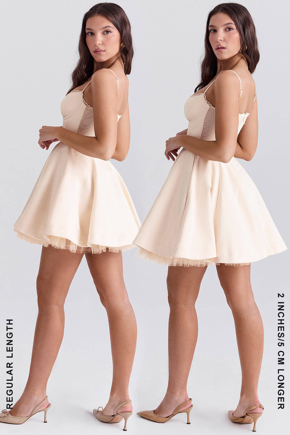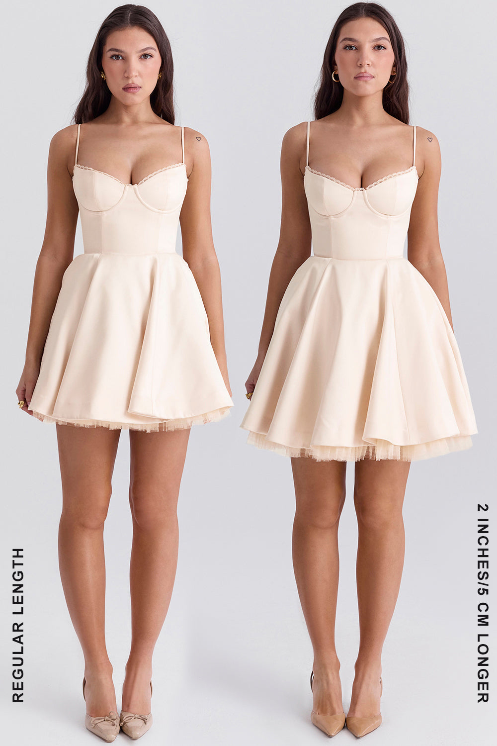 Wear yours with our 'Lola' high heels in sunkissed for a dainty look. The 'Regular' cup option suits cup size A-C whilst the 'Bigger' cup option suits cup size D-E. Taller girls, we heard you and this is available in two lengths, our regular mini length and 2 inches / 5cm longer. Regular length: Approx 79cm and Longer length: Approx 84cm.