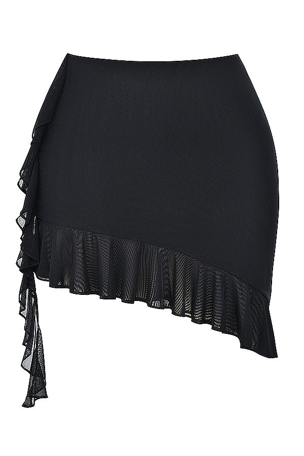 Pretty, feminine details are what this mini skirt is all about. Cut from soft stretch mesh in a classic black hue, it has an asymmetric silhouette that sits mid-rise at the waist and features a ruffled hemline that drapes effortlessly down the right thigh for revealing legs.
