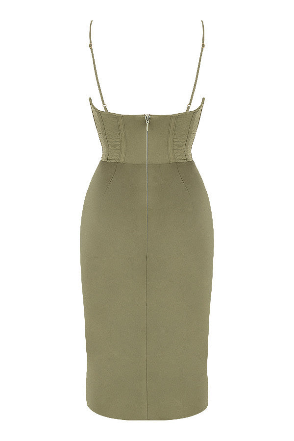 Delicate and dainty, HouseofCB updates the timeless slip dress with a beautifully draped cowl neckline. 'Myrna' is made from our lustrous silk satin in a soft olive tone and is cut on the bias for a beautiful drape and figure skimming silhouette. The bodice features our incredible corsetry boning to really cinch the figure in and is fully lined in a textured fabric for a non slip hold.
