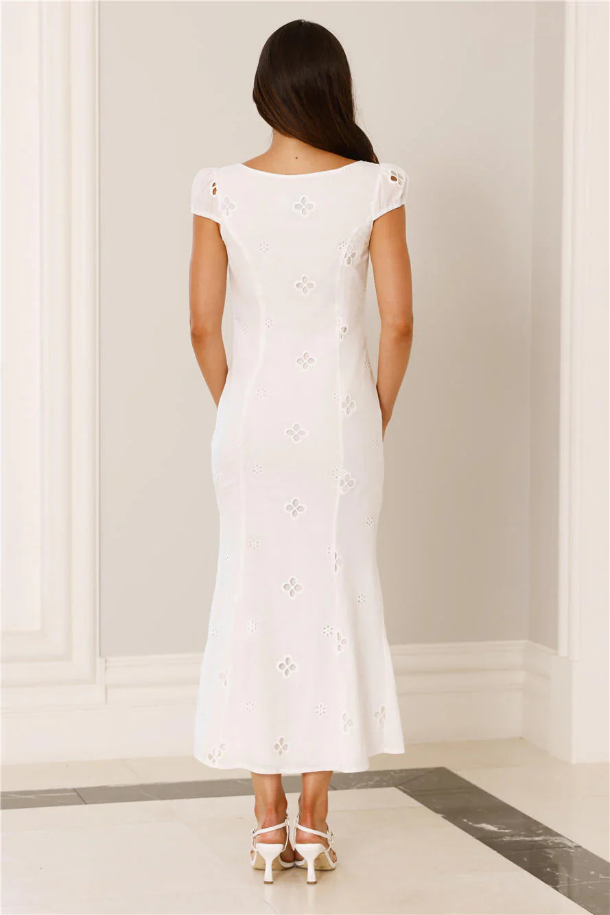 A summer fave. The Oceanfront Dreams Midi Dress features elastic sleeves, a button neckline and a gorgeous embroidered silhouette. Style with sandals for all the likes.