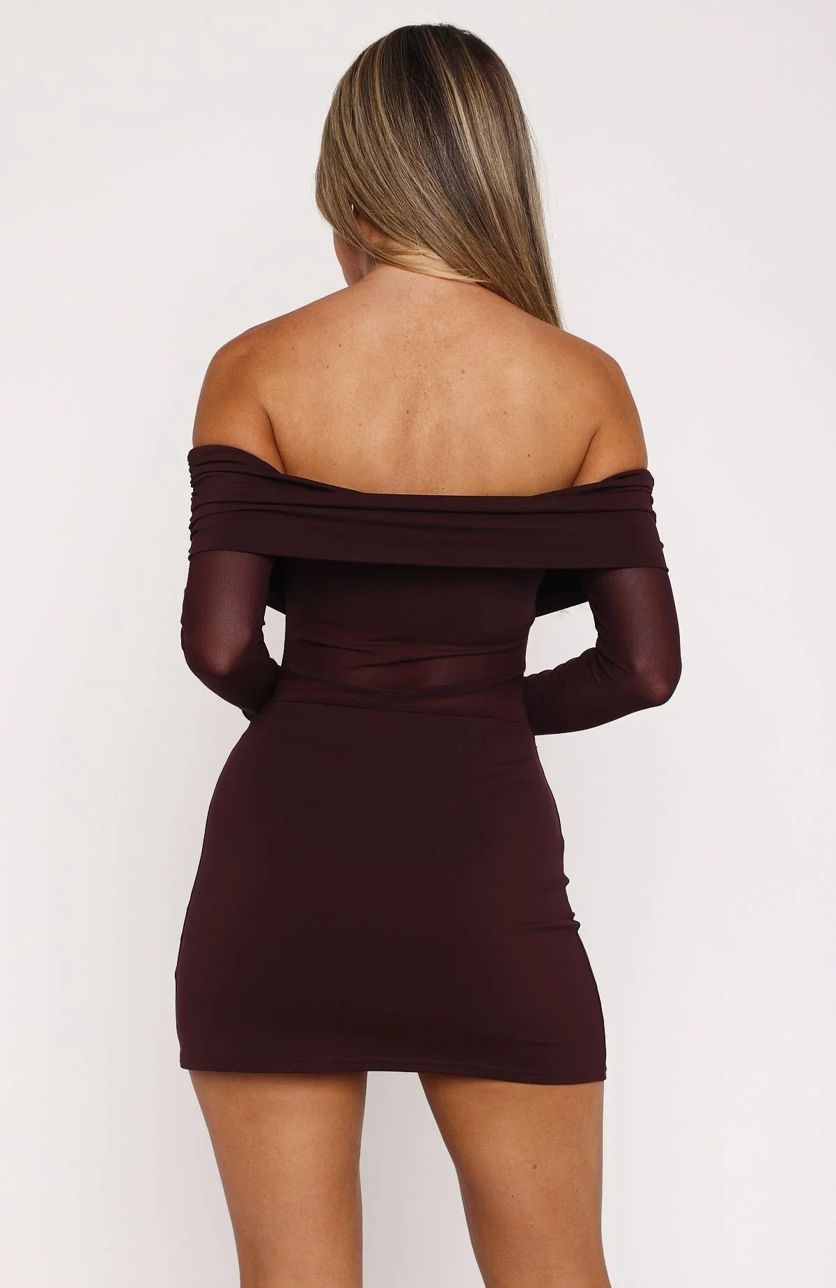 Your date night outfit dilemmas are sorted with the Own Your Story Long Sleeve Mini Dress Burgundy. Features an off the shoulder design, long sleeves with slight flare, mini length, sheer bodice and sleeves, ruched detailing, gorgeous fabric with an iridescent glow, and stretch material for an easy slip on design. Style with statement heels and a shoulder bag for a look that's sure to turn heads.