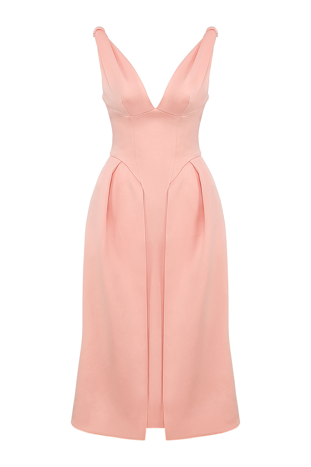 Our peach 'Paloma' midi dress is beautifully constructed from a heavyweight lustrous Duchess satin with a nod to elegant vintage silhouettes. This lady-like cut is defined by an ultra nipped waist extending out to a layered overskirt structured with tulle. The plunge neckline and pretty shoulder knots finish the elegant look.