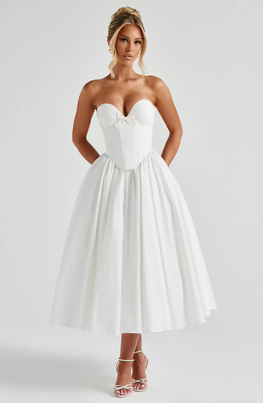 The Prim Midi Dress in ivory is a stunning blend of sophistication and allure, perfect for making a statement at any special occasion. This strapless design features a plunging sweetheart neckline that beautifully frames the décolletage, accented by a decorative bow between the cups for a charming touch. The boned corset overlay and underwired pleated cups deliver support and structure, ensuring a flattering fit. The romantic lace-up back allows for an adjustable finish, while the gathered full skirt flows gracefully from the waist, creating a timeless and effortlessly chic look.