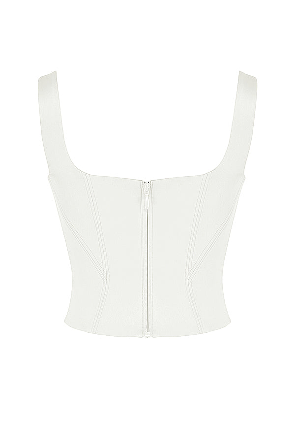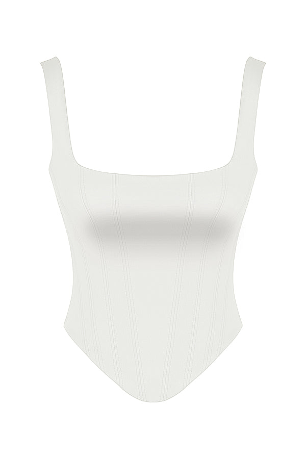 'Rafa' is beautifully crafted from our ultra luxe and lustrous duchess satin in delicate ivory that we love paired with trousers or denim. Inspired by traditional corsets, 'Rafa' has a longline silhouette that dips below the natural waistline with a bust flattering square neckline and features our incredible corsetry boning to really cinch the figure in for an ultra feminine hourglass shape.