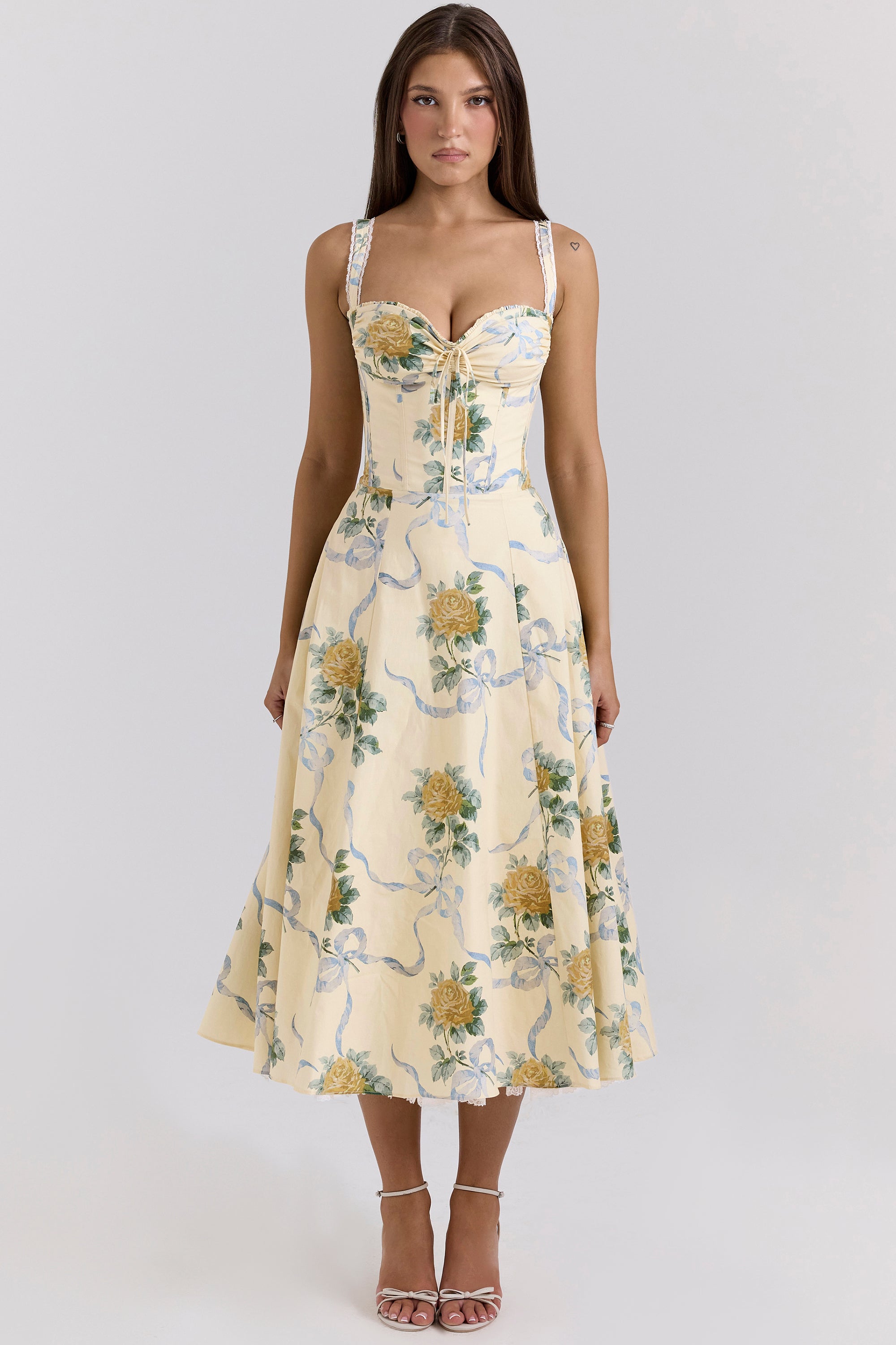 Sun drenched days call for a sundress as pretty and versatile as 'Rosalee'. Cut from crisp cotton printed with dainty florals and trailing vintage ribbons, it features our boned corsetry to cinch the waist, dainty lace trims to the straps and hem and the game changer - secret side pockets! What more can a girl ask for? The layered tulle underskirts give 'Rosalee' that dreamy, twirl-worthy movement that's oh-so-charming.