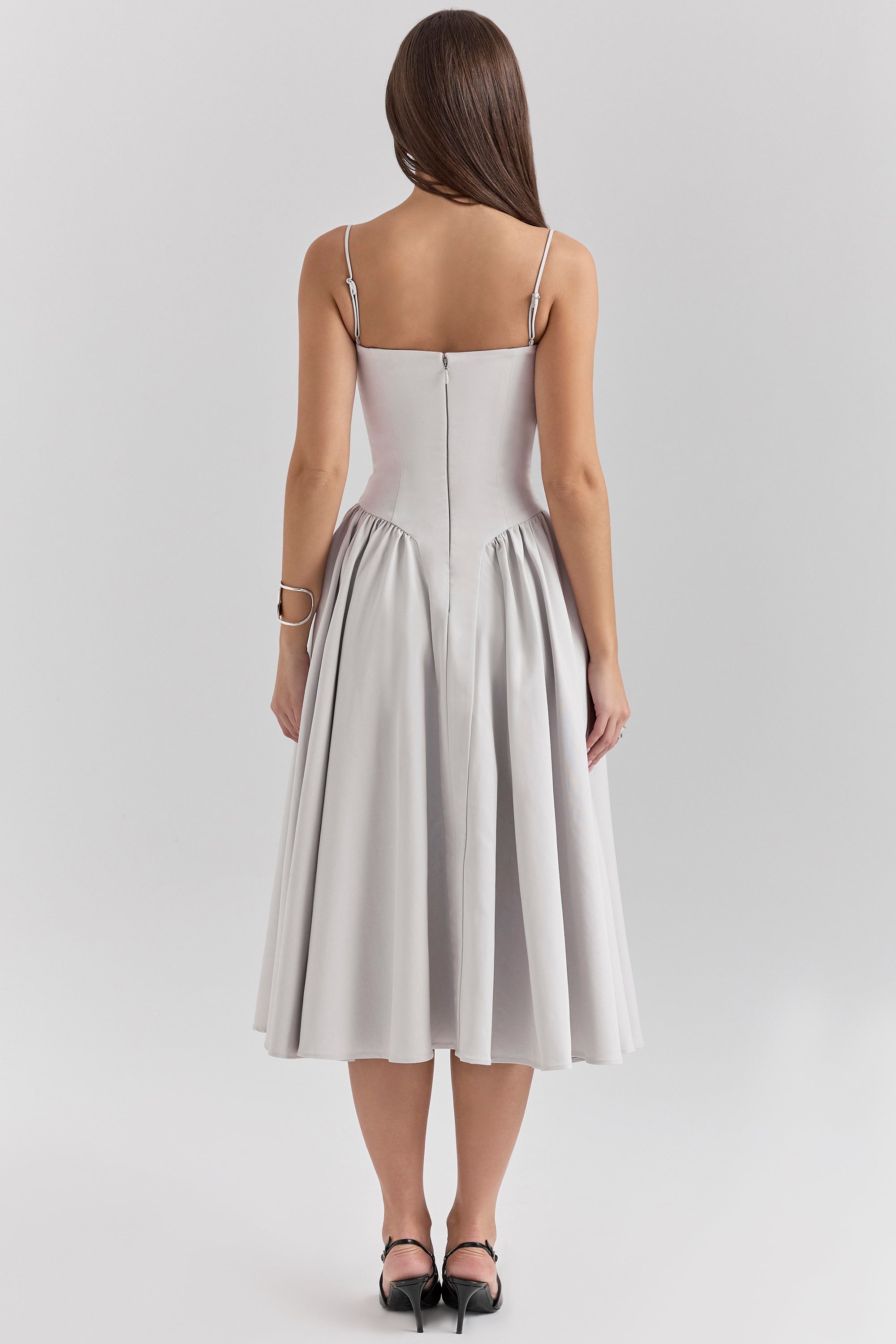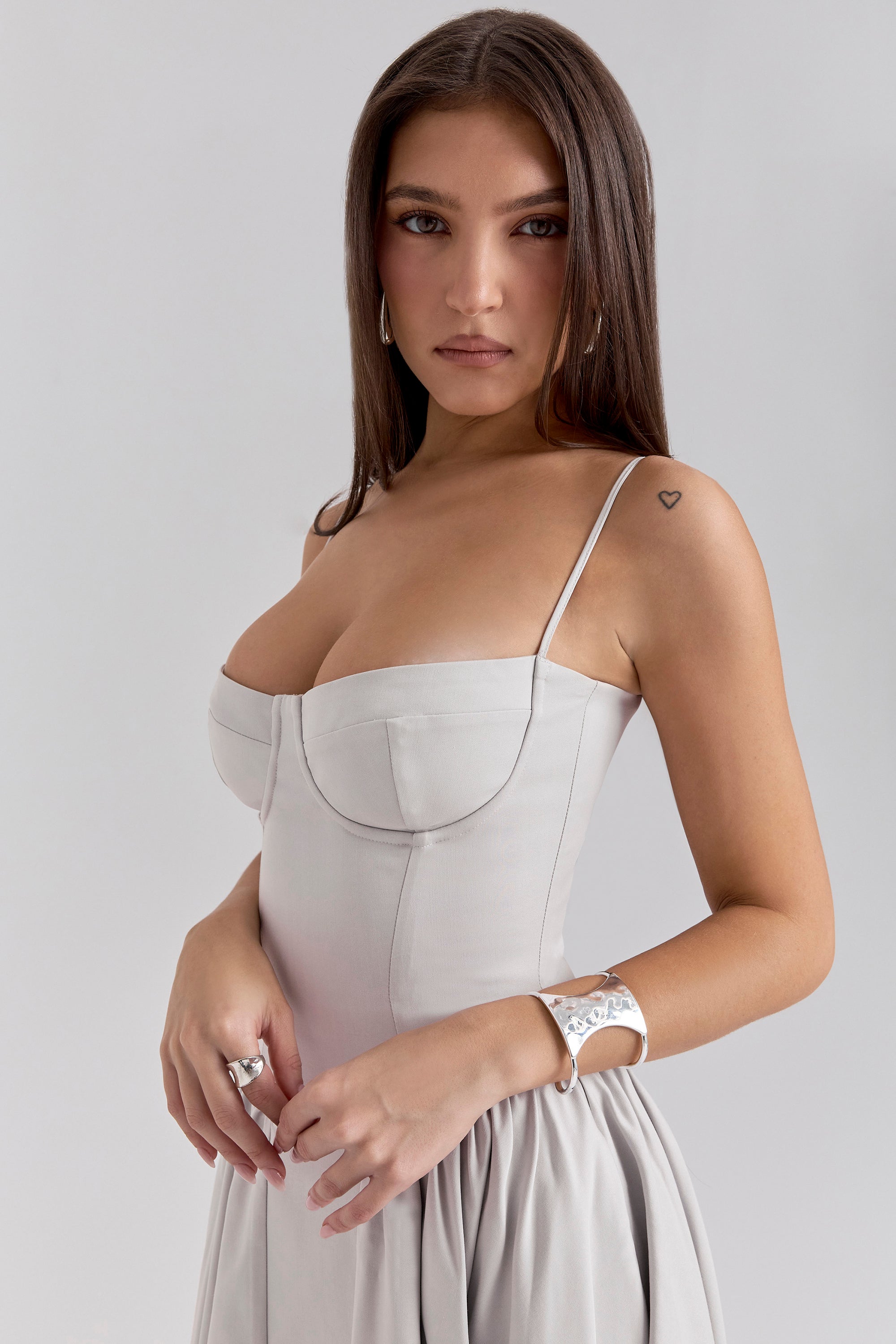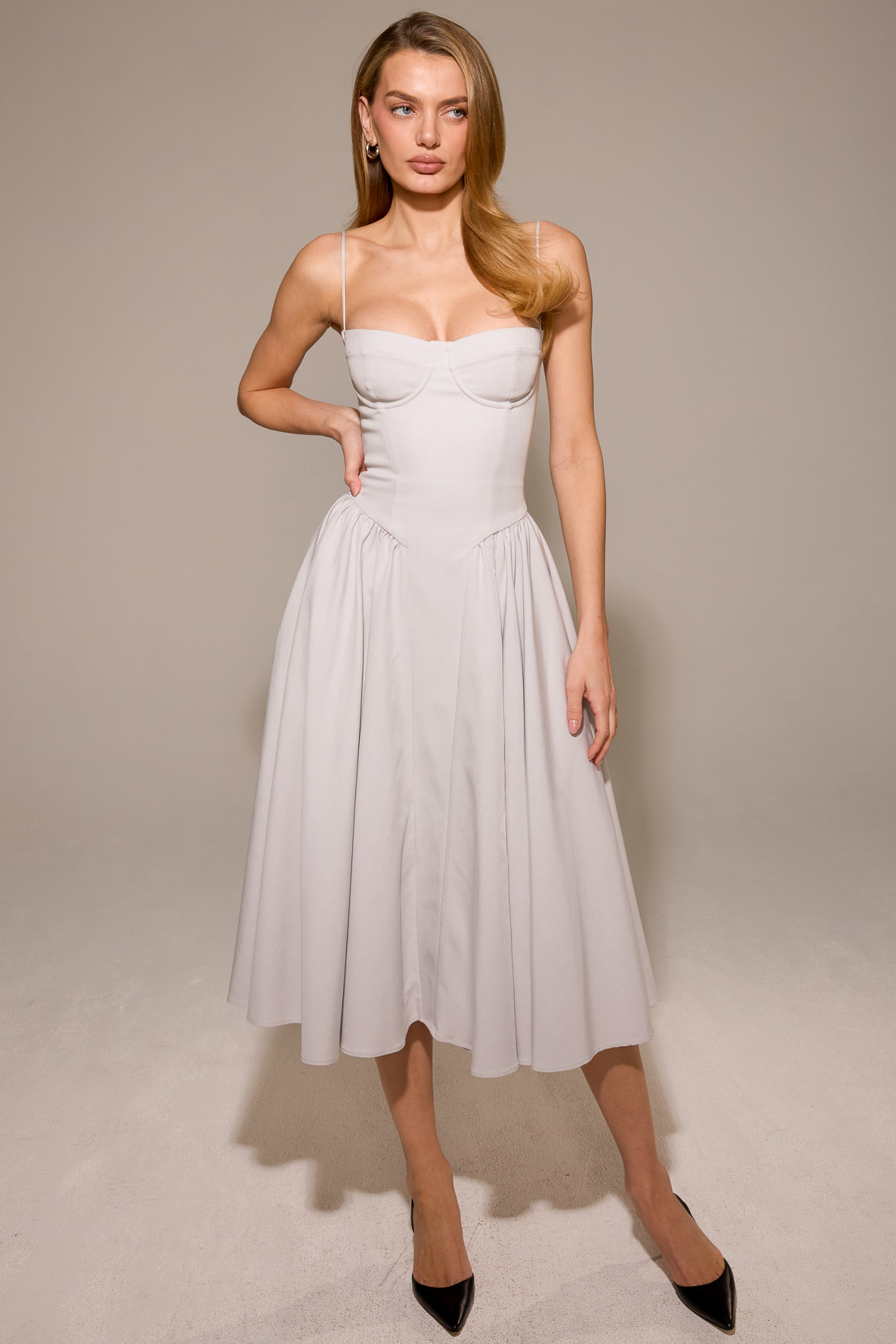 Dressing up is always fun in the 'Samaria' Dress. This elegant midi-length style is made from a soft peached twill with panels in the skirt creating a soft volume (there's even secret side pockets). The bodice is boned in a way that expertly hugs your figure and the spaghetti-style straps are a cute nod to 90s styling. At House of CB, fit is everything – this one is available in two cup sizes and features a centre back zip.