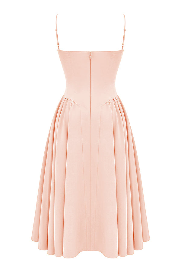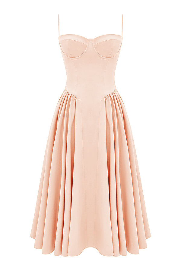 'Samaria' is your perfect for all seasons, one and done dress. Cut from a stretch twill fabric, it's boned through the bodice to cinch the waist and has a pretty sweetheart neckline with underwired cups. The barely there straps adjust for the perfect fit and we love how the gathering adds pretty volume to the midi skirt.