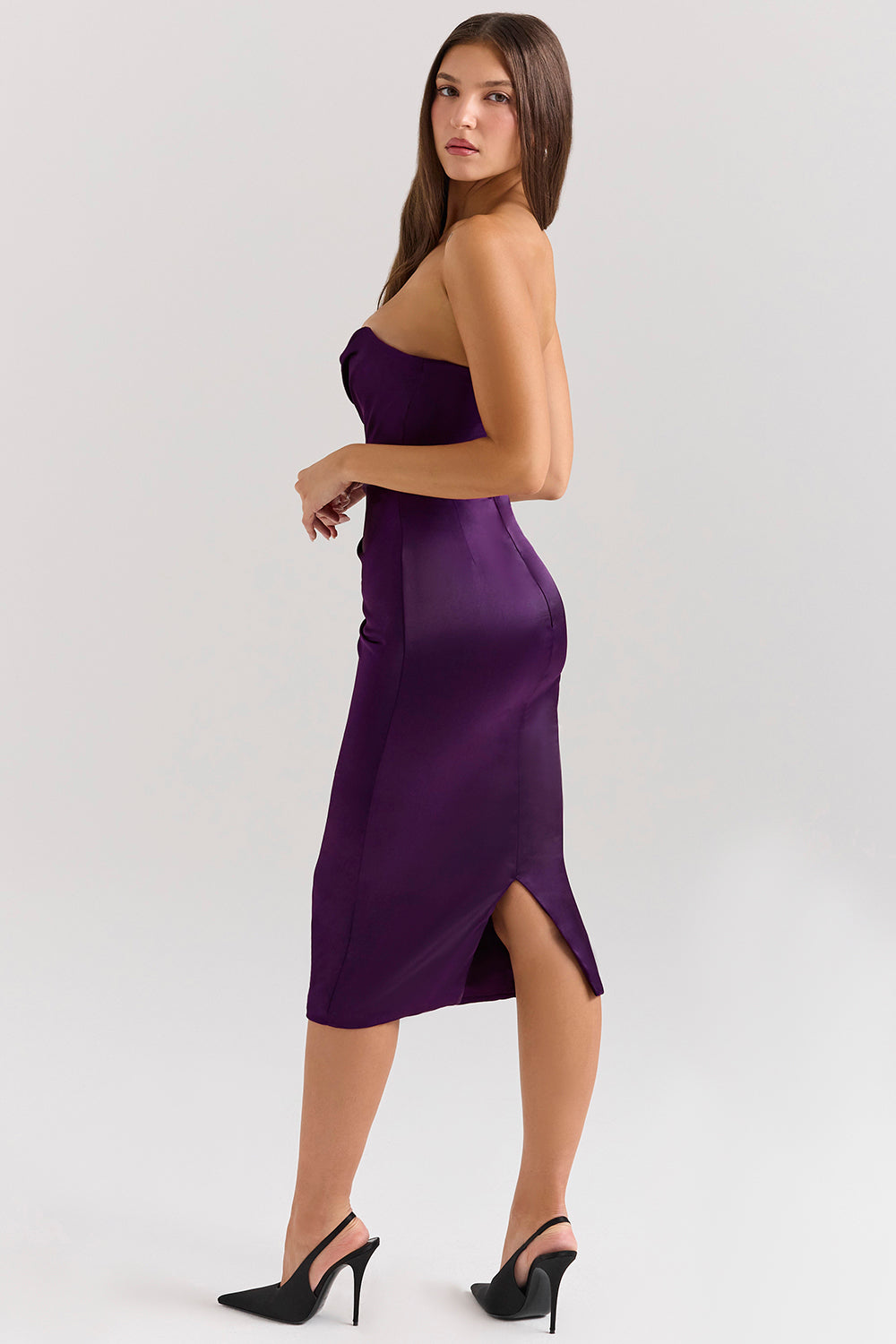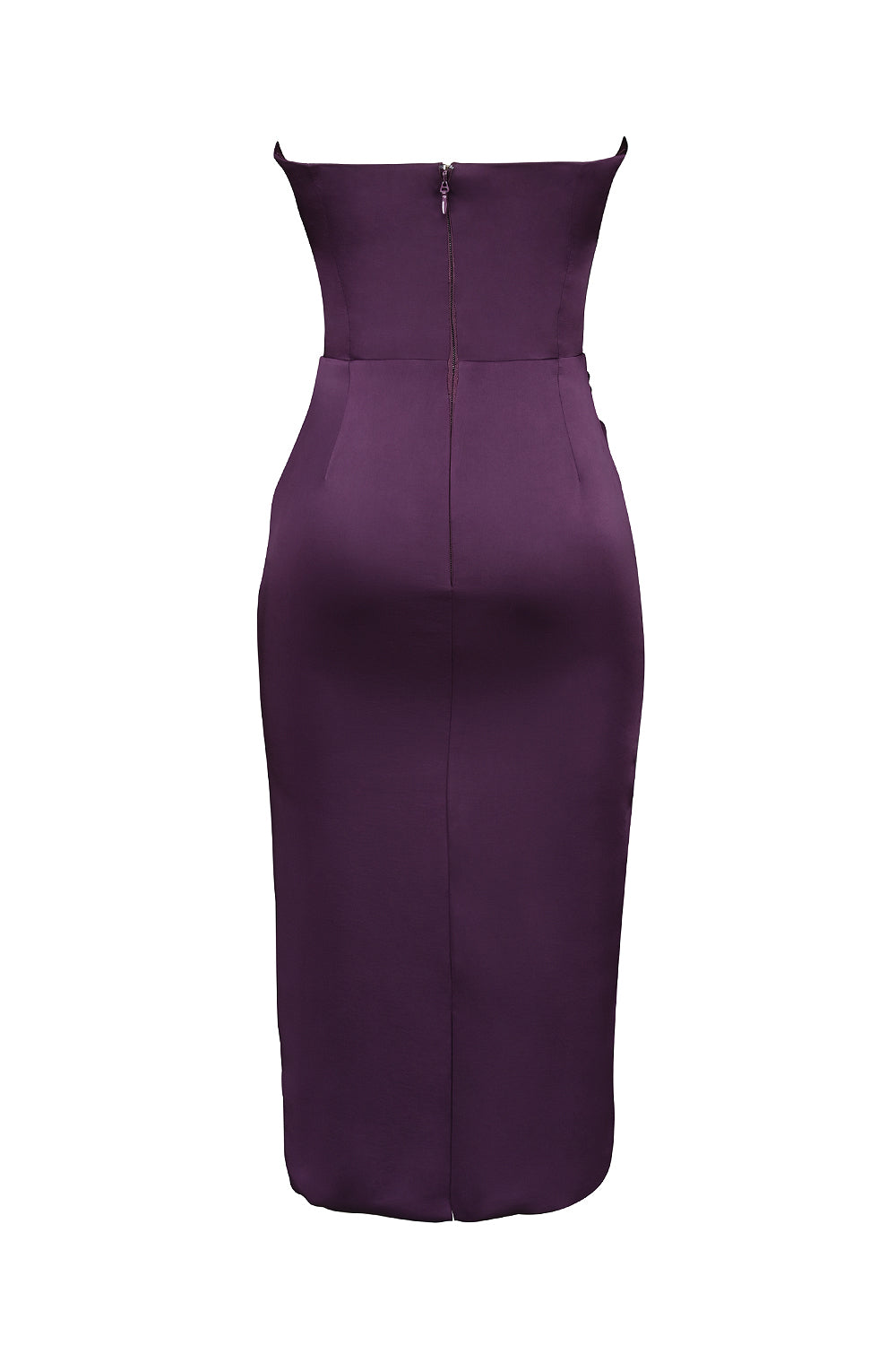 HOCB’s 'Santana' Grape strapless satin midi dress redefines elegant evening wear for your most special events. Crafted from luxurious duchess satin with a lustrous finish, 'Santana' offers a beautifully draped, strapless fit that highlights sophistication and style. The sculpted bodice features internal corsetry and larger cup options to enhance and define the waist, providing a flattering, comfortable fit for both regular and fuller busts. Designed with a back zipper for easy on and off, this formal satin midi dress pairs effortlessly with neutral heels for a complete, refined look. Perfect for weddings, galas, and evening occasions, Santana is the ultimate choice for making a lasting impression.