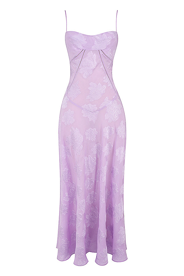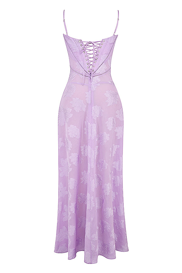'Seren' is perhaps our most romantic dress yet and we're loving the corset inspired lace up back for a vintage feel. It's cut from a luxurious sheer jacquard in a soft orchid hue, embellished with floral blooms. 'Seren' is underwired for a flattering bust with delicate rouleau shoulder straps.