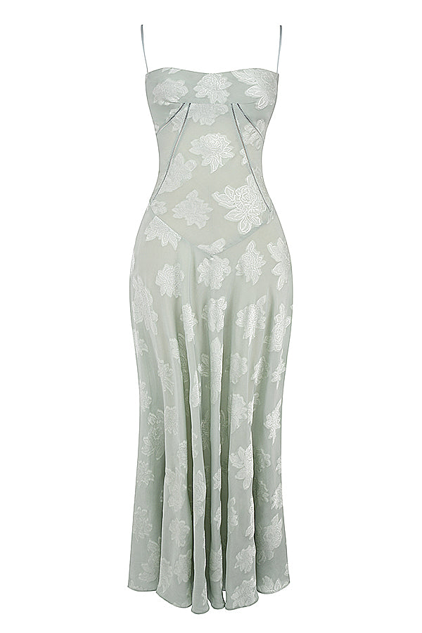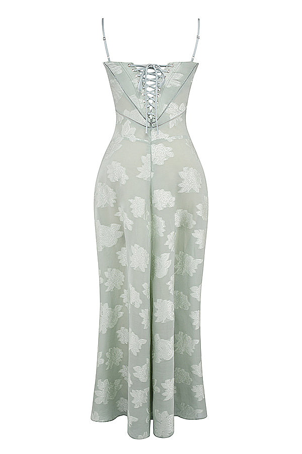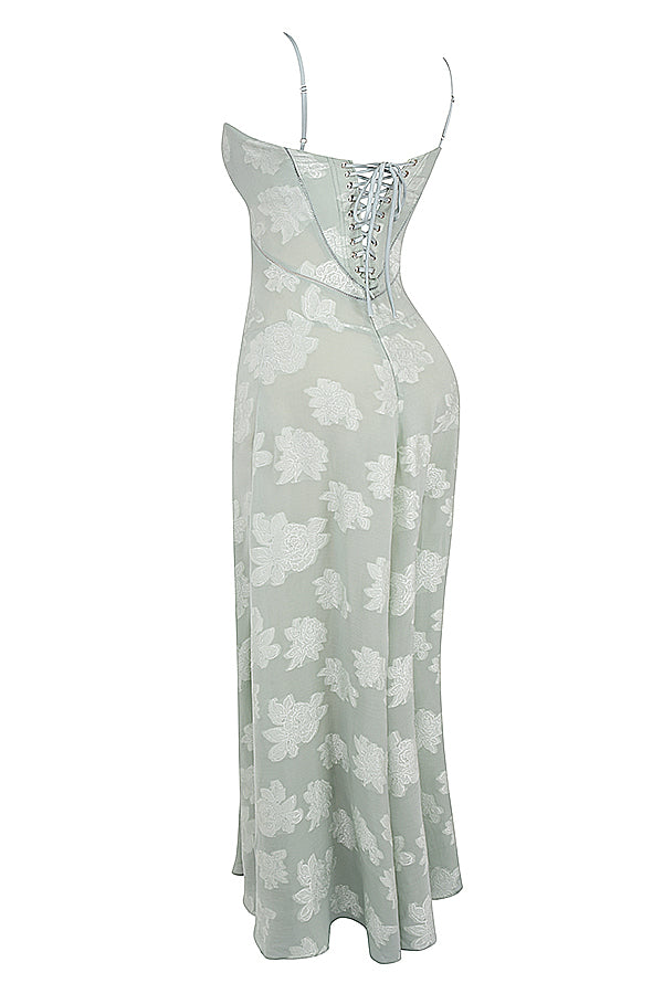 'Seren' is perhaps our most romantic dress yet and we're loving the corset inspired lace up back for a vintage feel. It's cut from a luxurious sheer jacquard in a soft pistachio hue, embellished with floral blooms. 'Seren' is underwired for a flattering bust with delicate rouleau shoulder straps.
