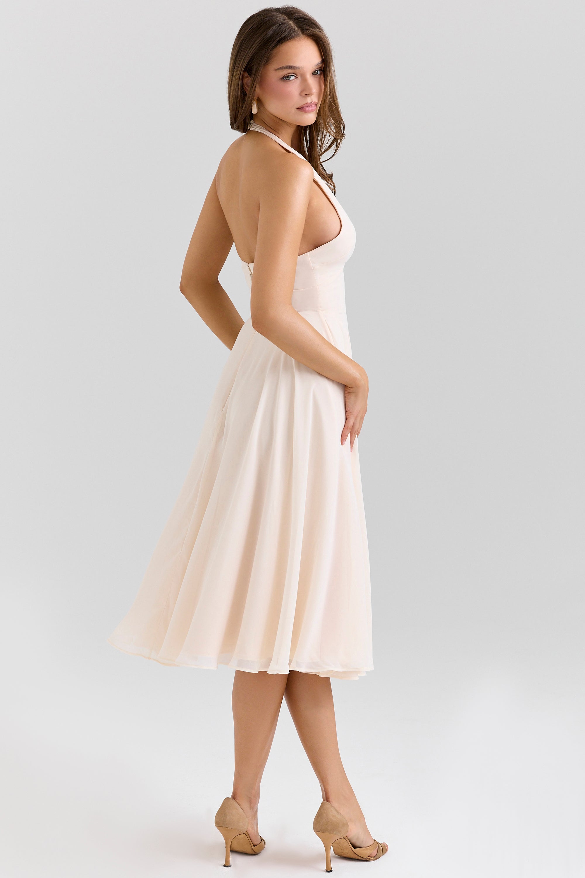 'Solada' is every girl's dream dress with its romantic and vintage-inspired fit. Cut from a floaty georgette in a vintage cream tone, it's fully lined for a luxurious finish that flatters. 'Solada' also features a daring plunge neckline, framing halter neck cut and turns to reveal a statement open back.